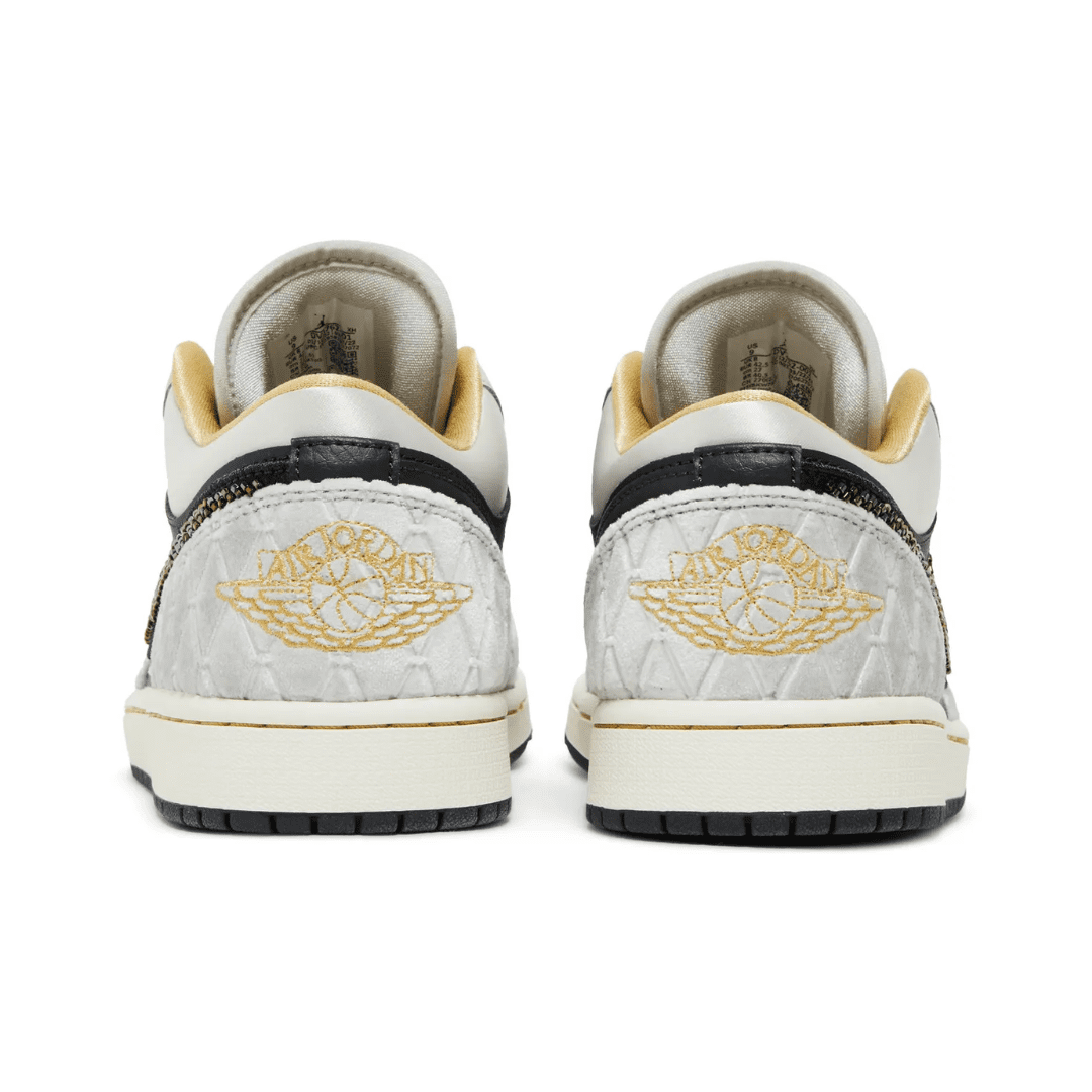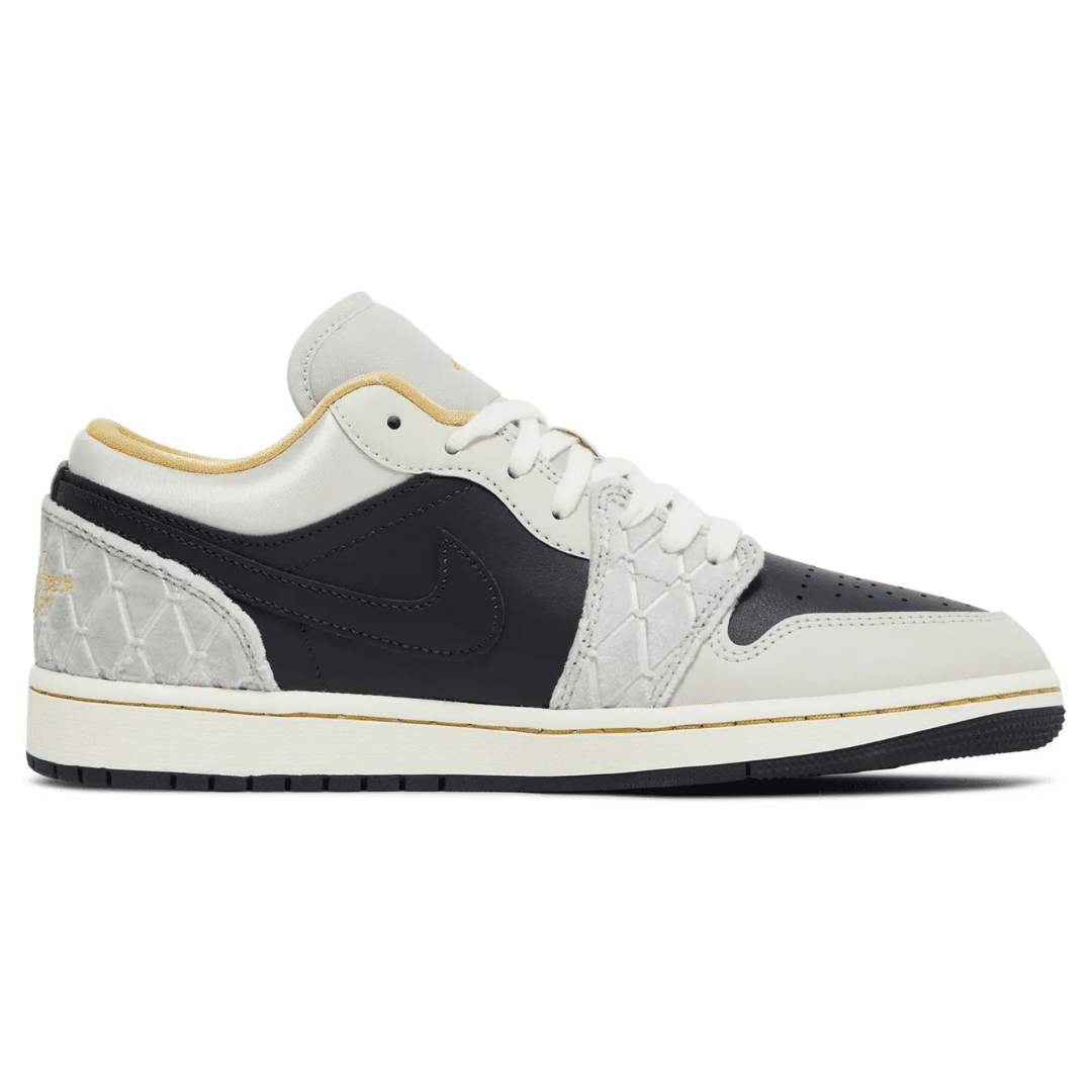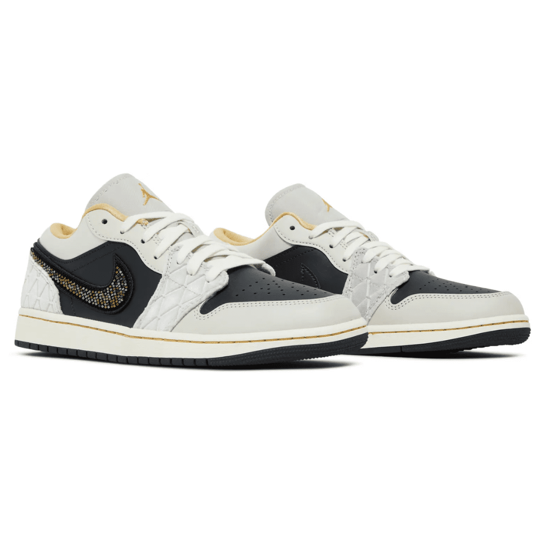 The Air Jordan 1 Low Beaded Swoosh is a premium lifestyle variation of the silhouette that has become common since the Jordan line’s debut in 2022. It has paneling made of leather, satin, and suede with diamond patterns. Available in a black and gray color pattern with subtle undertones of gold for a luxurious touch. The low-top is further distinguished by an iridescent beaded Swoosh, and a sail midsole completes the design, with gold stitching and a black rubber outsole.