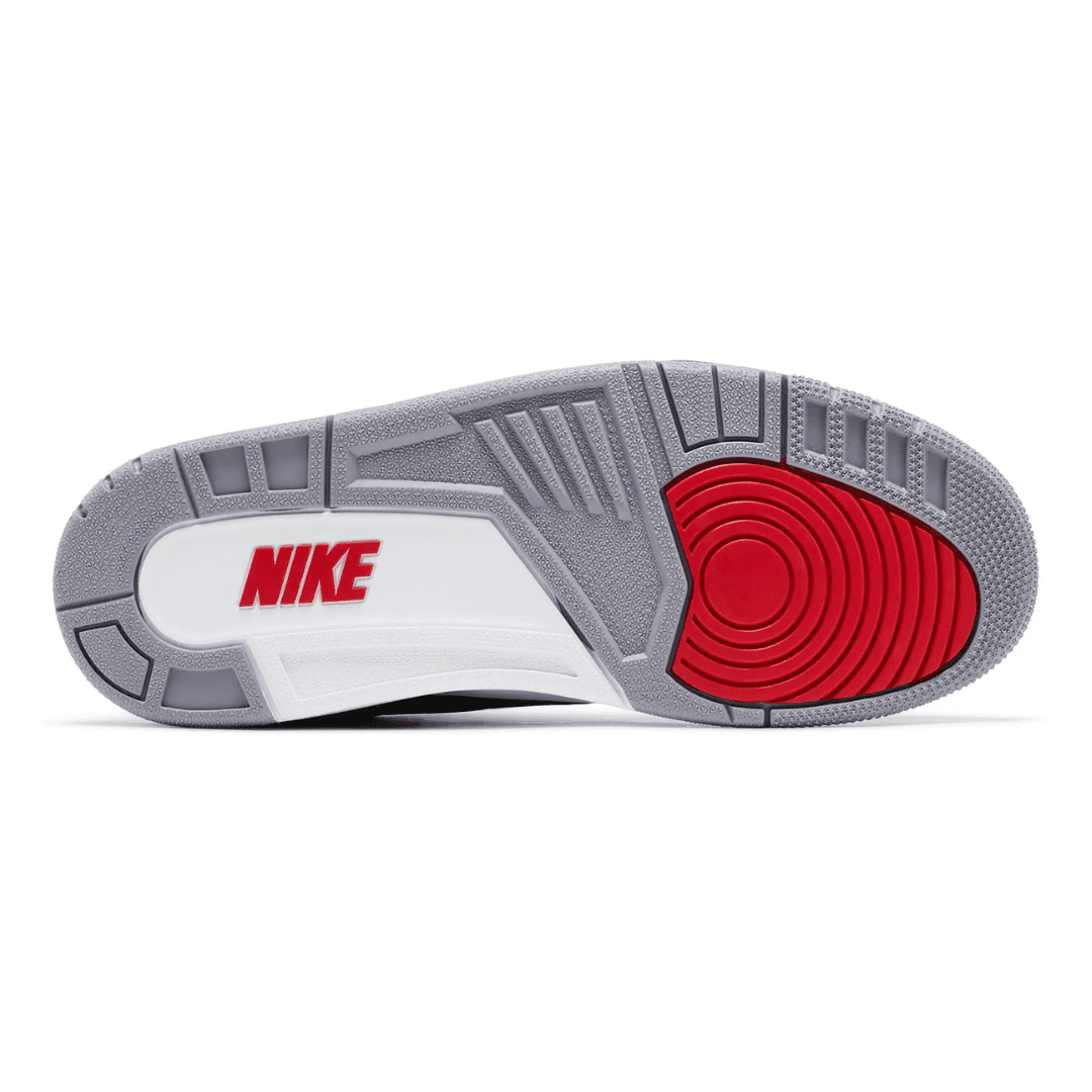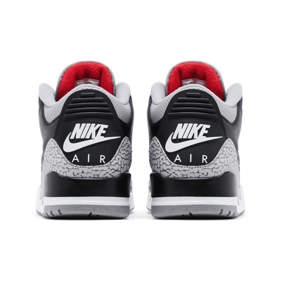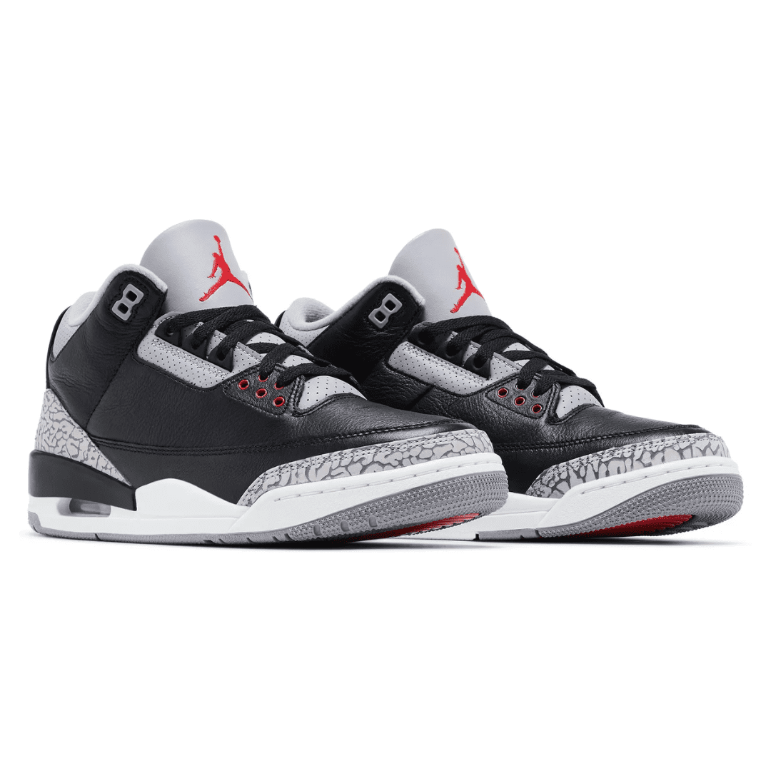 The 2024 edition of the Air Jordan 3 Retro OG ‘Black Cement’ revives an iconic colorway of the legacy silhouette. This release is true to the 1988 original, featuring a black tumbled leather upper with grey elephant print overlays at the forefoot and heel. An embroidered Jumpman in Fire Red graces the tongue, while a raised Nike Air logo decorates the back heel. The sneaker sits atop a white polyurethane midsole, fitted with visible Air-sole cushioning and accented with a splash of black along the heel. A grey rubber outsole provides durable traction underfoot.