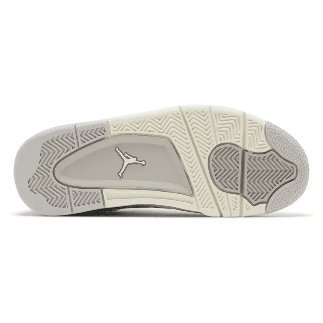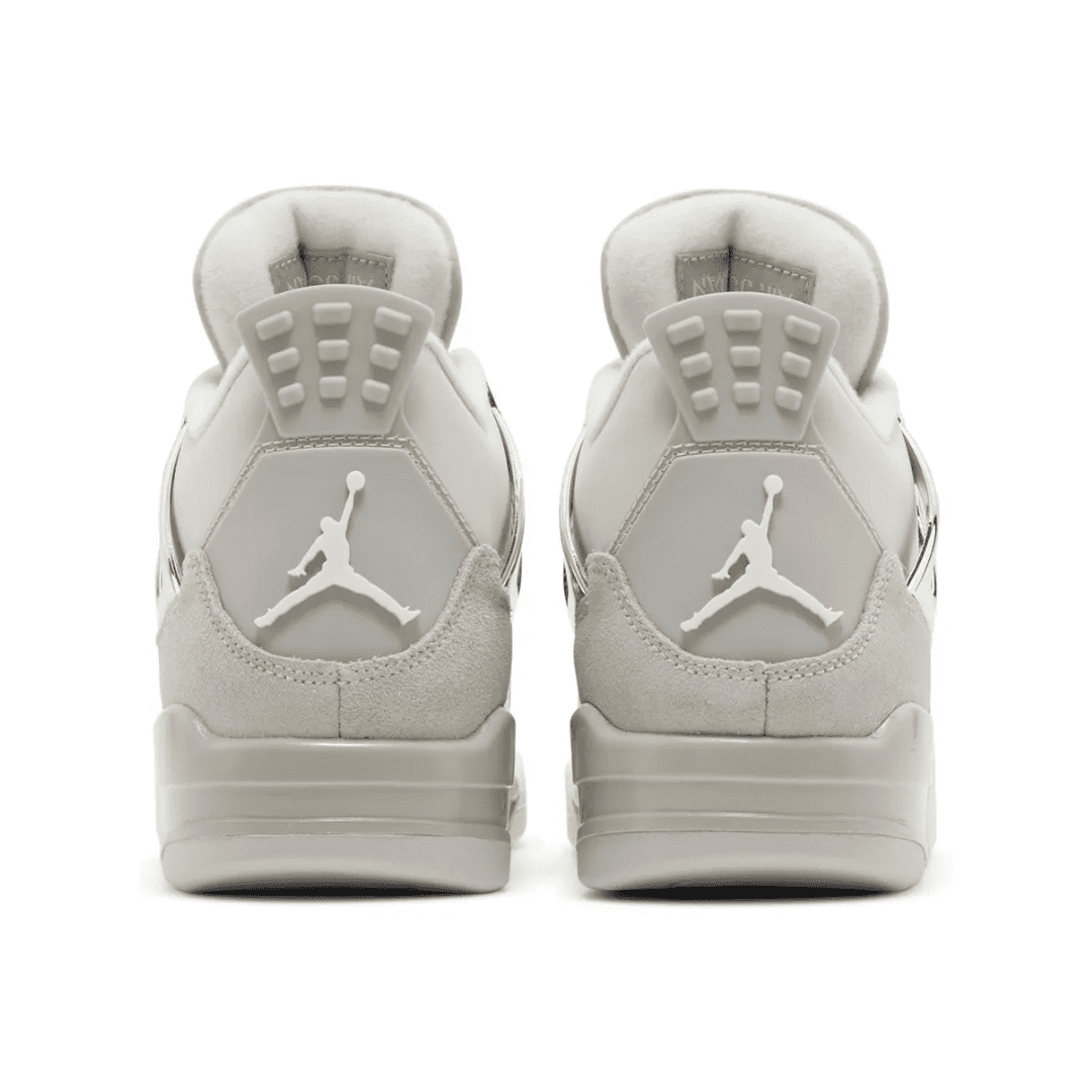 The Women’s Air Jordan 4 Retro ‘Frozen Moments’ features a pale grey suede upper with a color-matched forefoot overlay in glossy leather. Breathable netting is utilized on the throat and quarter panel, while the shoe’s molded eyelets and support wings shine in a metallic silver finish. Tonal Jumpman branding embellishes the tongue and molded heel tab. Anchoring the sneaker is a grey foam midsole with visible Air-sole cushioning in the heel.
