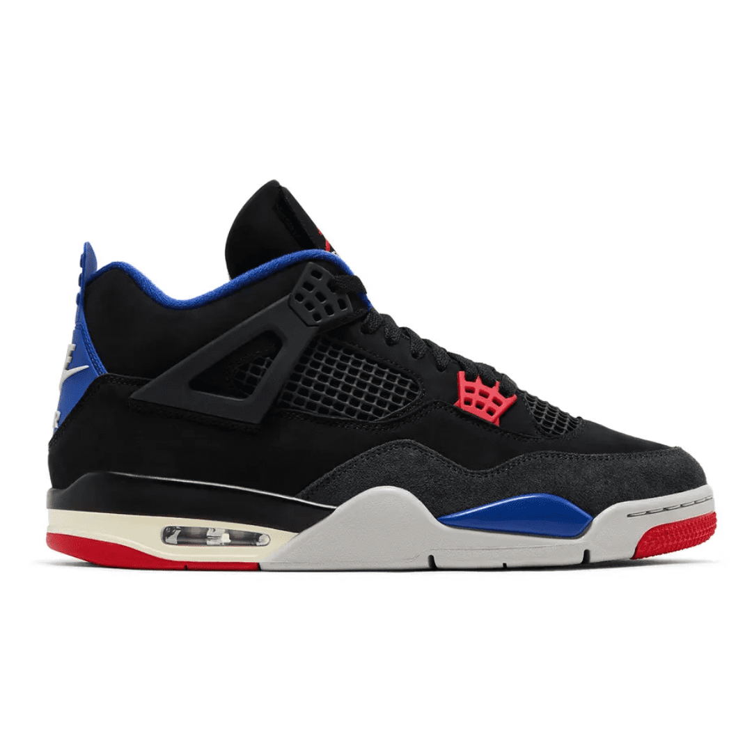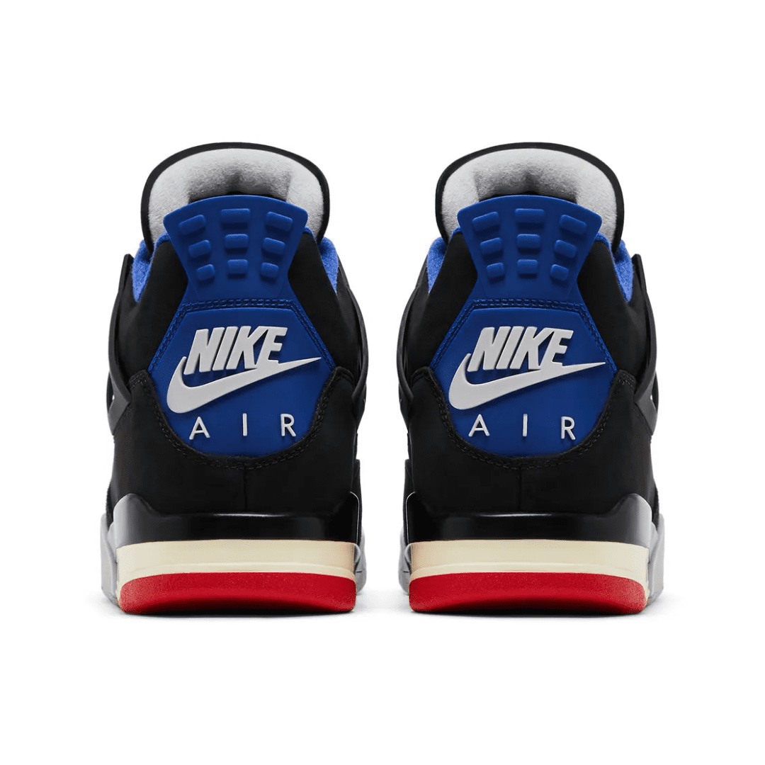The Air Jordan 4 Retro ‘Rare Air – White Lettering’ makes use of a black nubuck upper with quarter panel netting, TPU support wings, and molded eyelets in matching black and Fire Red. Outlined in contrast white stitching, a grey suede overlay reinforces the forefoot. The collar is lined in royal blue textile, matching a heel tab marked with Nike Air branding. Interchangeable Velcro patches decorate the tongue, while a ‘Rare Air’ logo graces the sockliner. Anchoring the sneaker is an Air-assisted polyurethane midsole, featuring a color-popped accent in royal blue and a splash of black around the heel.