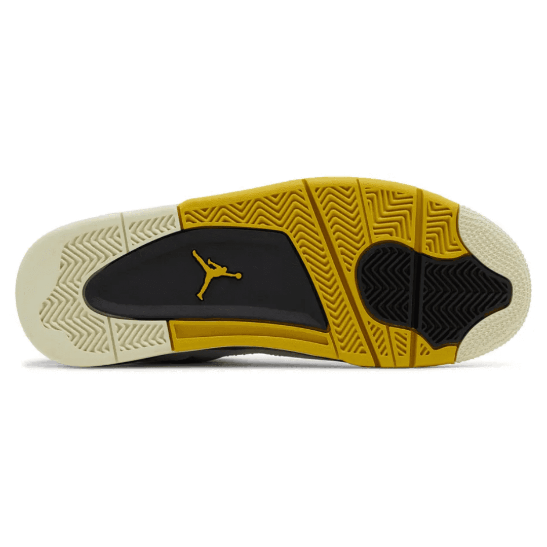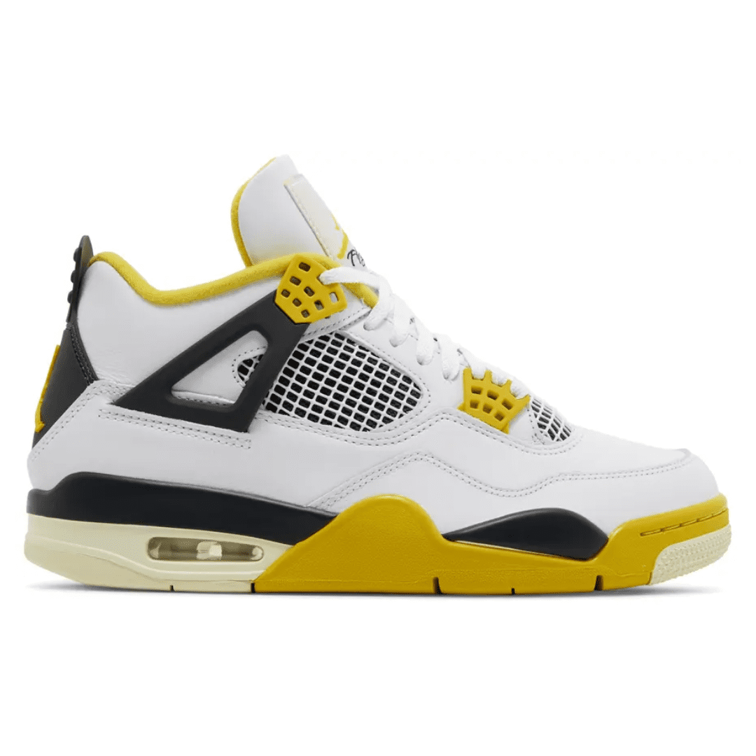The Women’s Air Jordan 4 Retro ‘Vivid Sulfur’ is built with smooth white leather featuring signature AJ4 details, including breathable quarter panel netting and black TPU support wings. Contrasting yellow accents land on the molded eyelets, interior lining, and the Jumpman branding hits that adorn the tongue and back tab. The sneaker rests on a two-tone polyurethane midsole, fitted with a visible Air-sole unit in the heel.