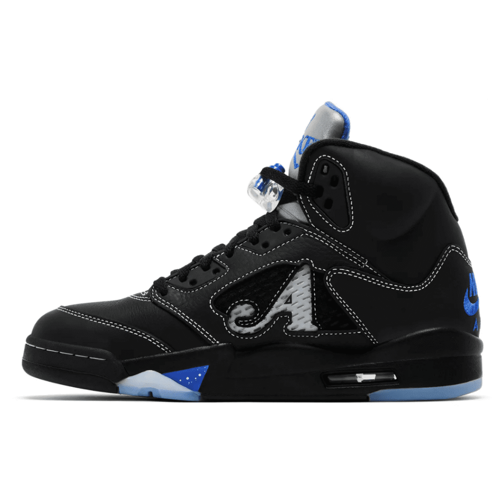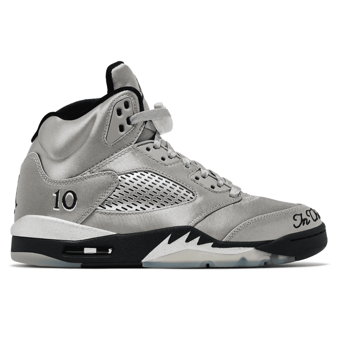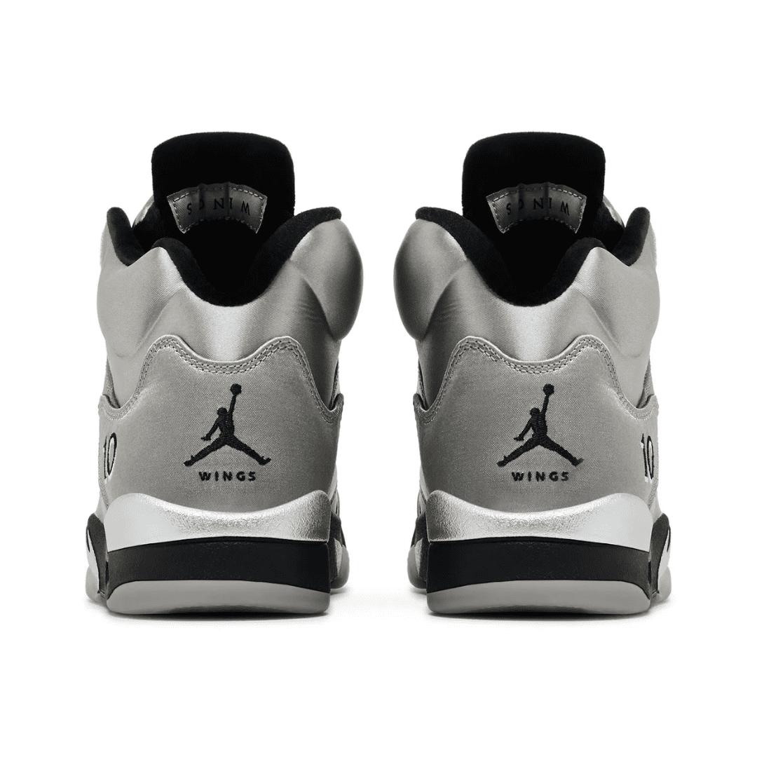 The Women’s Air Jordan 5 Retro ‘Wings’ celebrates the 10-year anniversary of Jordan Brand’s scholarship program. The silver satin upper features grey molded eyelets and breathable quarter panel netting. ’10’ is embroidered on the lateral heel, while an inscription across the toe of each shoe reads ‘In This Family No One Flies Alone.’ Standard Jumpman branding adorns the tongue and back heel, where the logo is accompanied by ‘Wings’ branding.