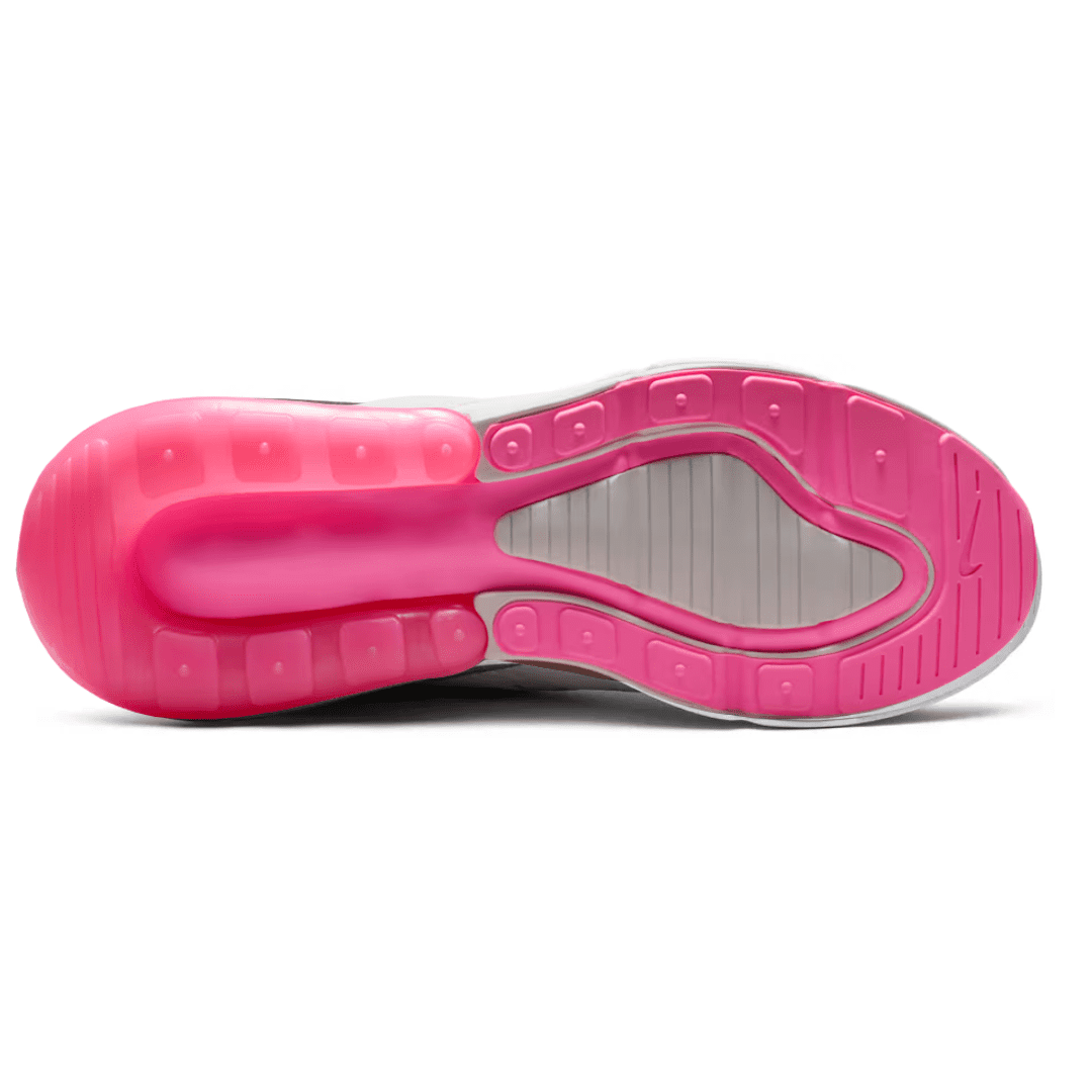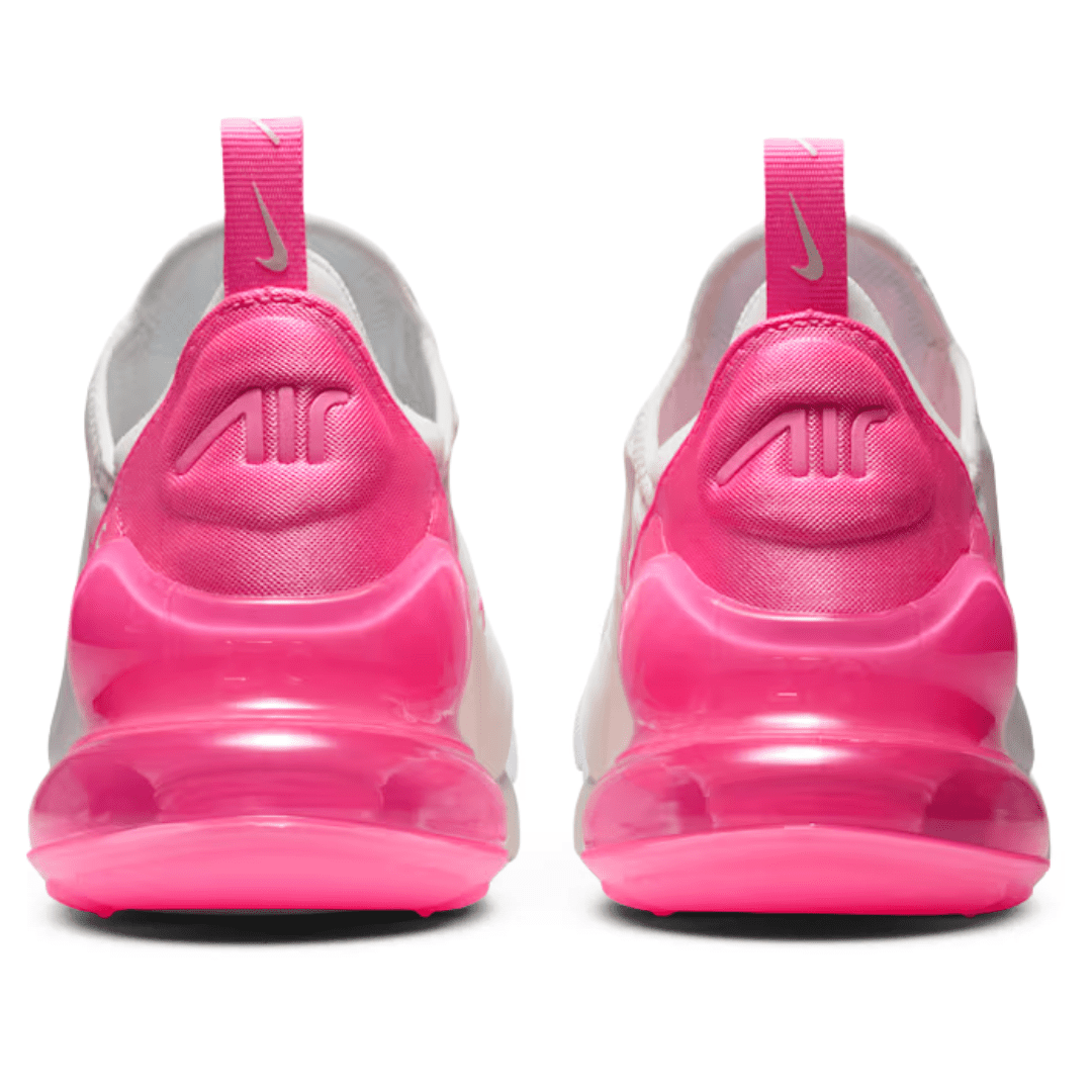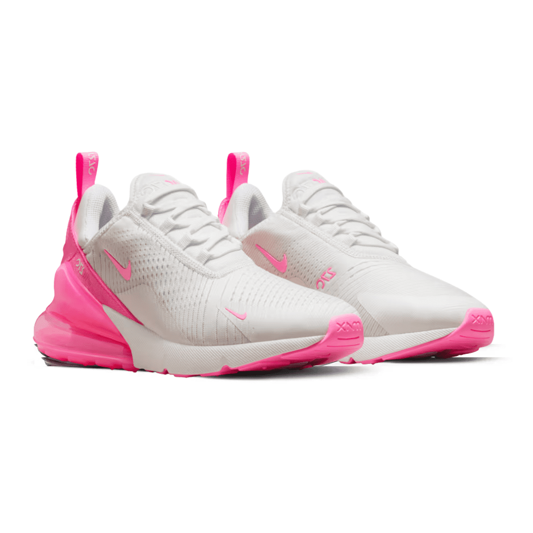 The Air Max 270 draws inspiration from the legendary Air Max 180 and Air Max 93, blending heritage design with modern comfort. The ‘Summit White / Pink Spell’ colorway features a clean white mesh upper accented by soft pastel pink details across the heel, tongue, and Swoosh, creating a fresh, feminine look.