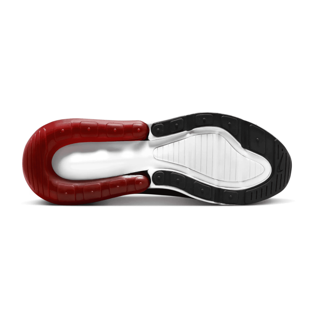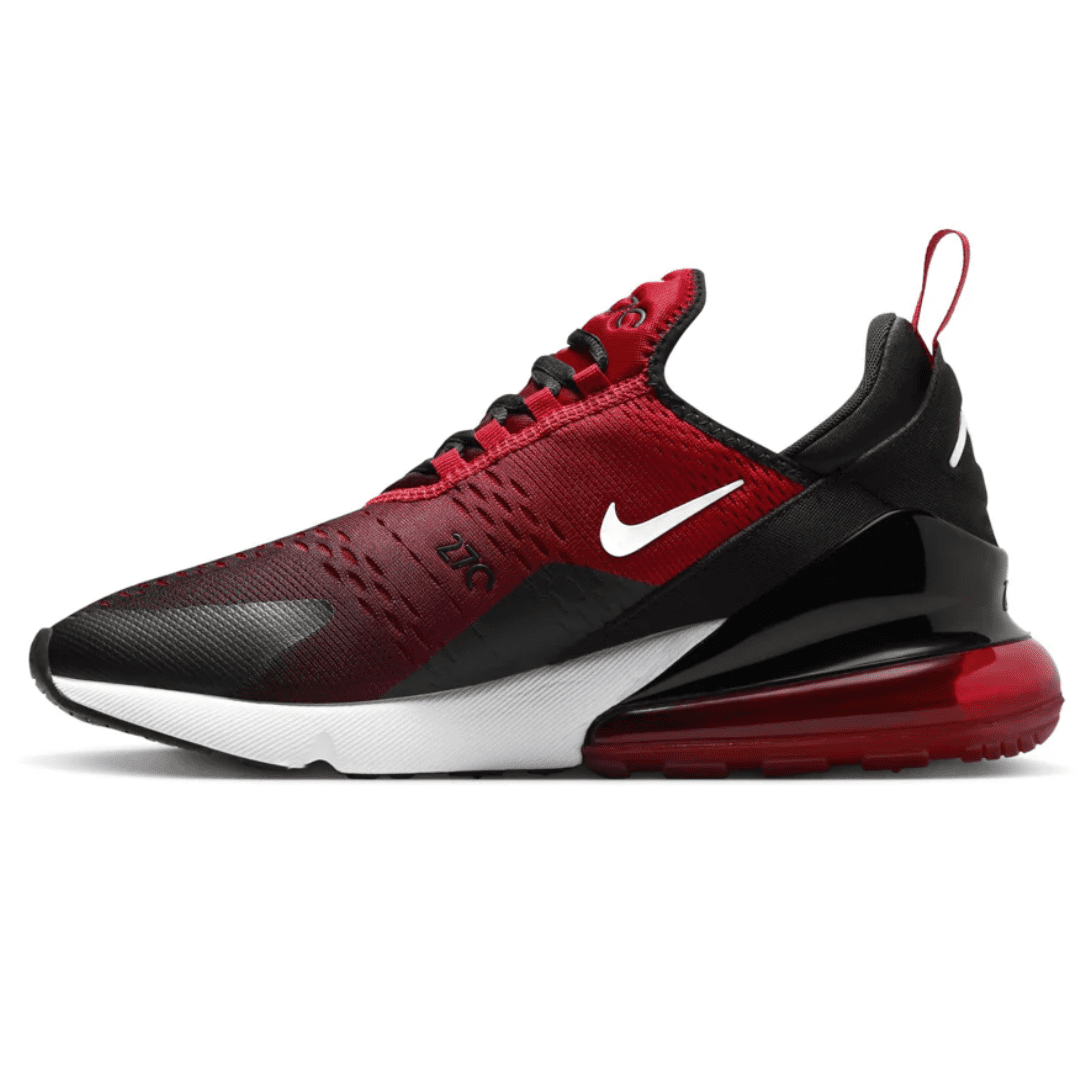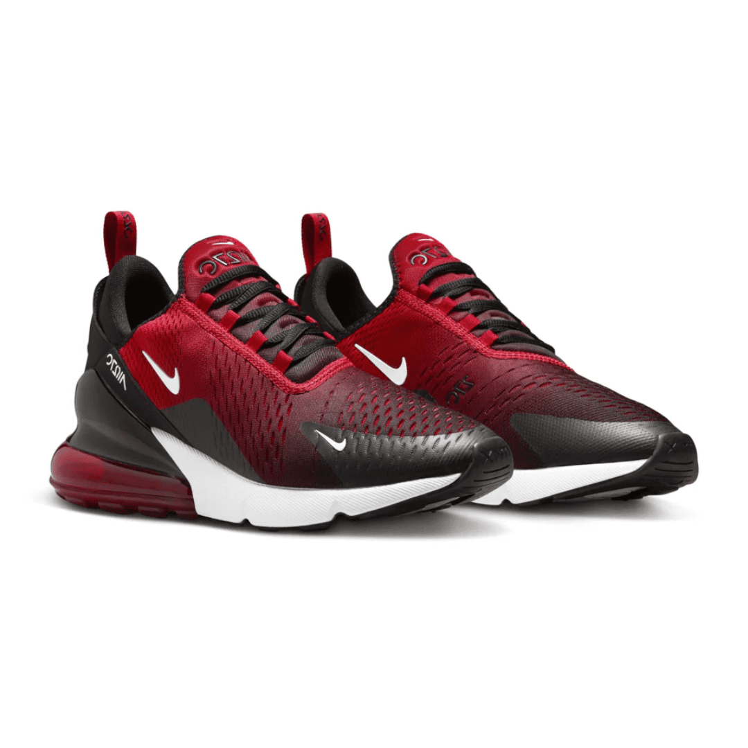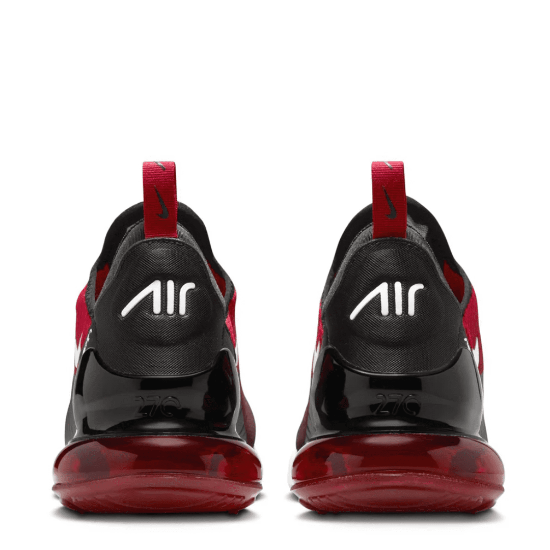 The Air Max 270 combines inspiration from the classic Air Max 180 and Air Max 93 to deliver bold style and modern comfort. The ‘Gym Red / Black / White’ colorway features a striking red mesh upper accented by black detailing along the heel, tongue, and Swoosh, balanced by a crisp white midsole for a dynamic, athletic look.