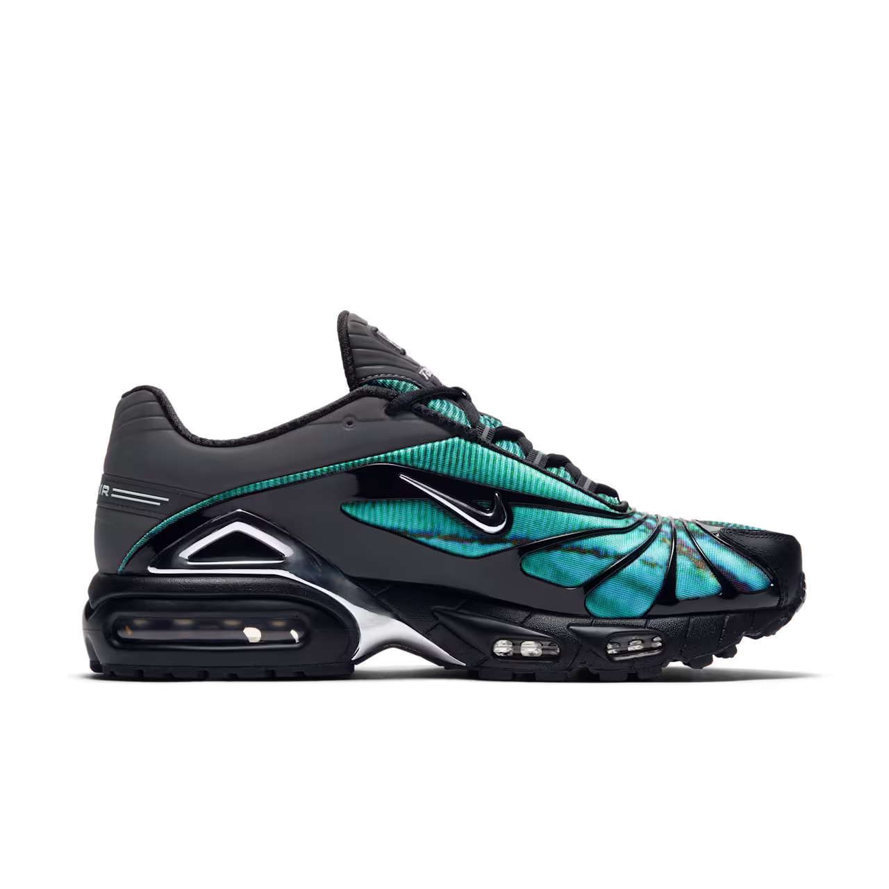 The Skepta x Nike Air Max Tailwind V revives a 2000s classic with a bold, futuristic edge. Featuring butterfly wing-inspired graphics, black webbed overlays, and chrome heel accents, this collaboration blends Skepta’s creative vision with iconic Air Max style. Visible Air cushioning delivers comfort, while iridescent blue details complete the standout look.