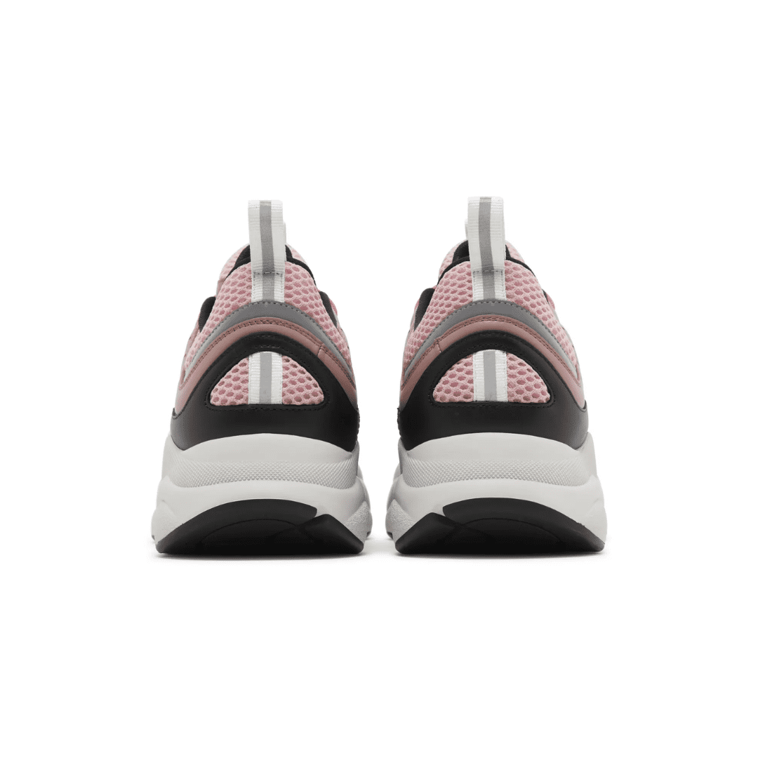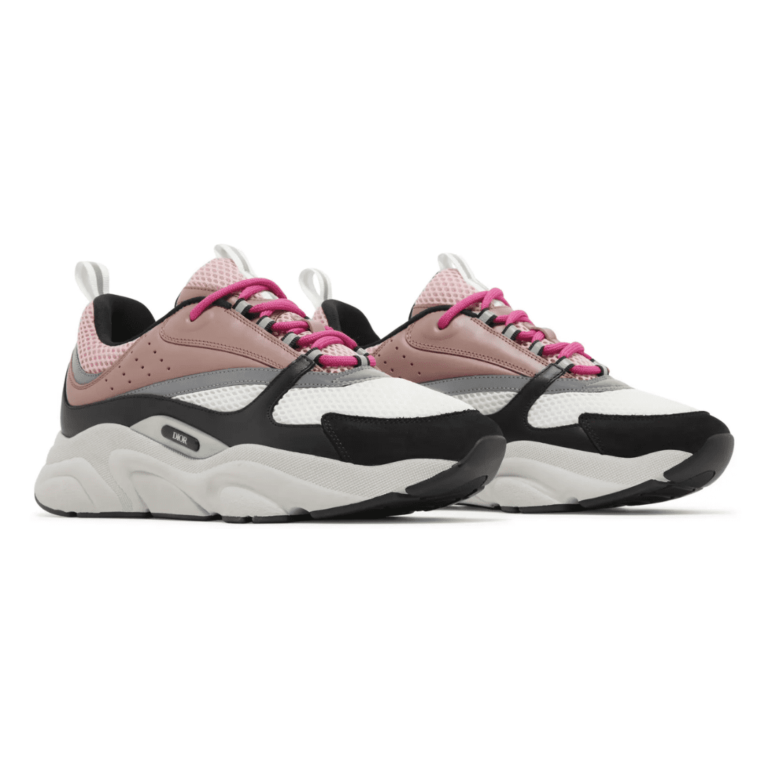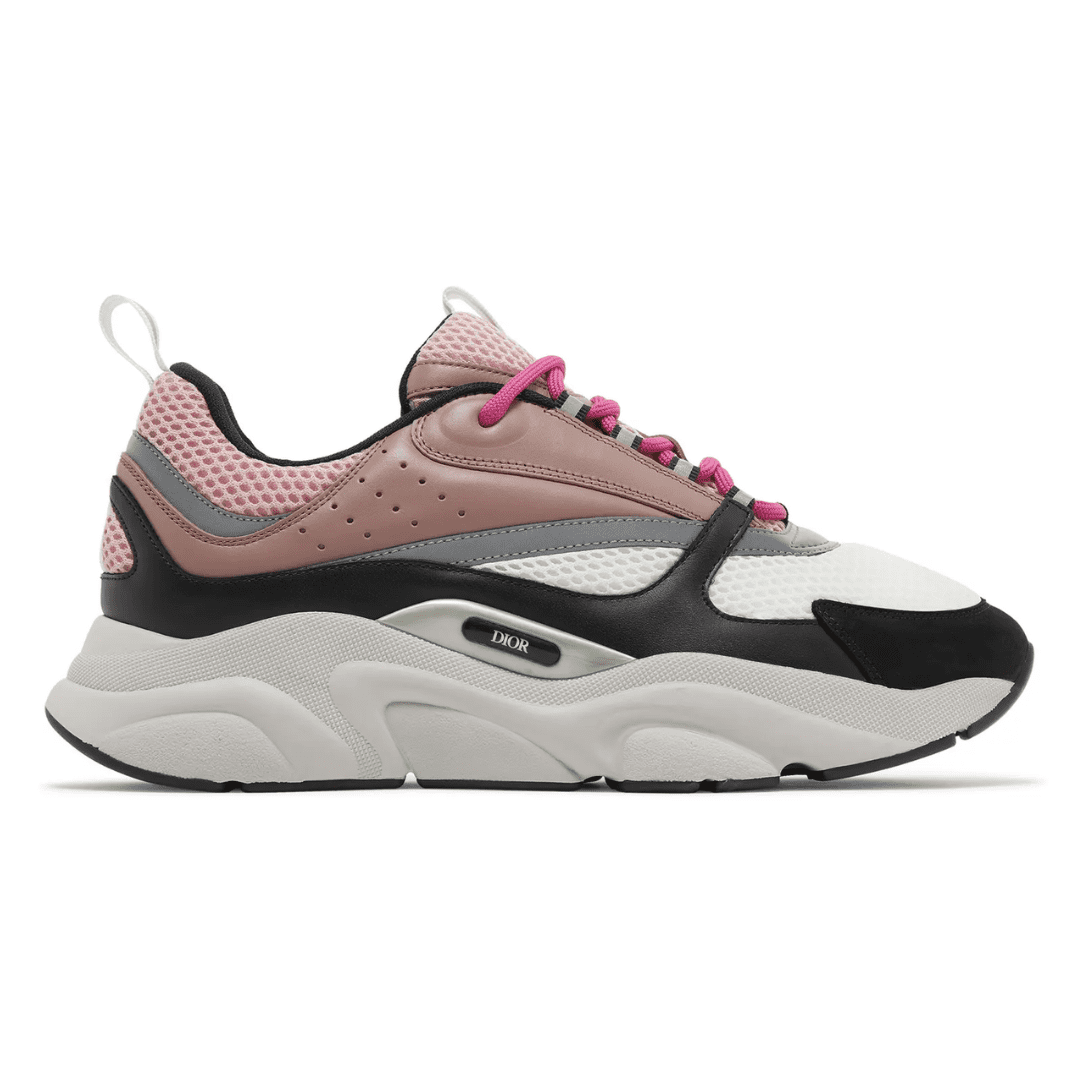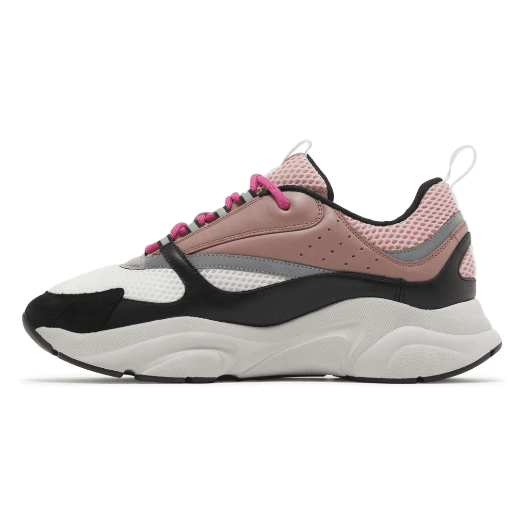 The Dior B22 ‘Burlwood’ brings a playful yet refined edge to the luxury trainer lineup. Featuring soft pink leather overlays, white mesh panels, and black suede detailing, the design is completed with grey accents and bold pink laces. A sculpted midsole provides comfort and a contemporary streetwear aesthetic, blending elegance with urban flair.