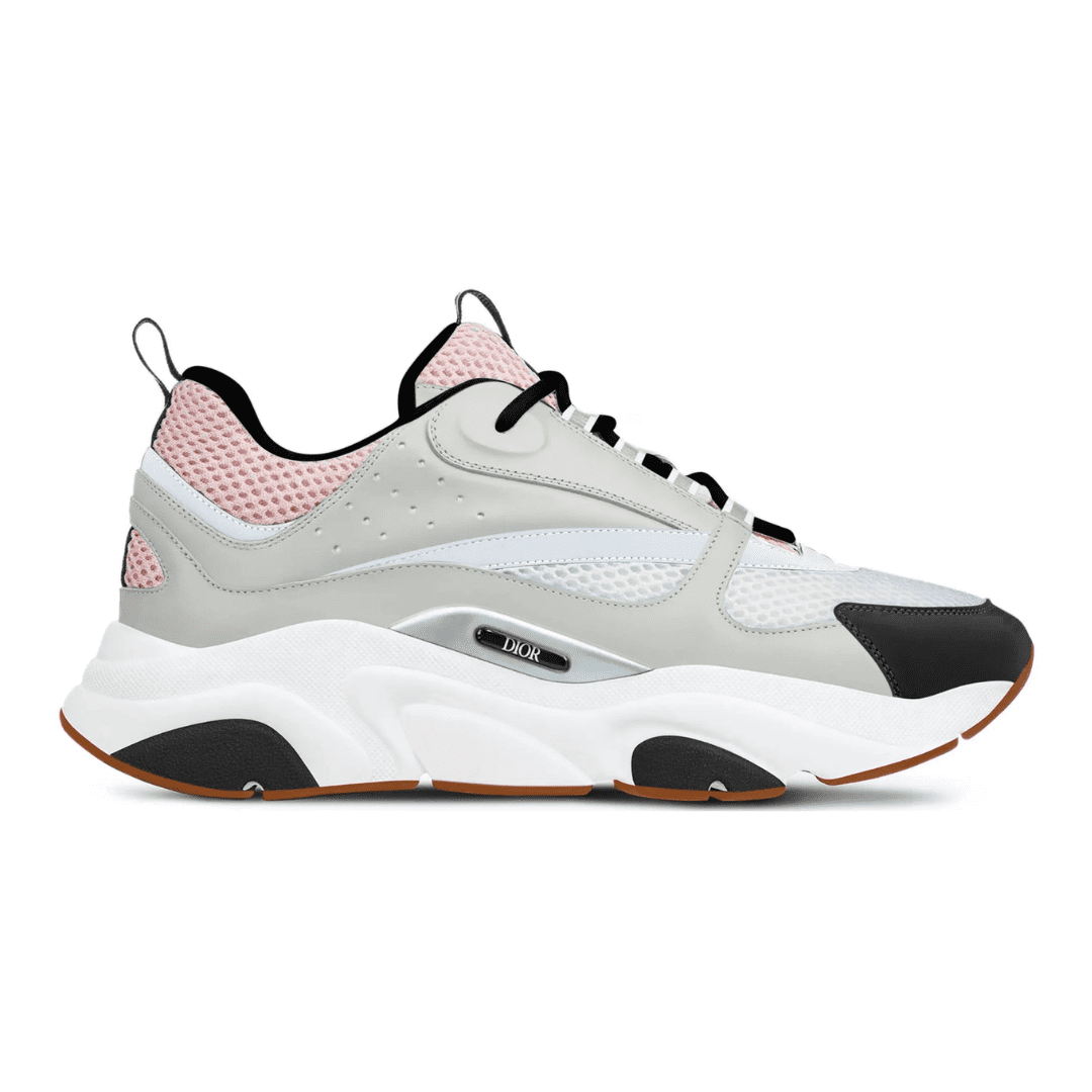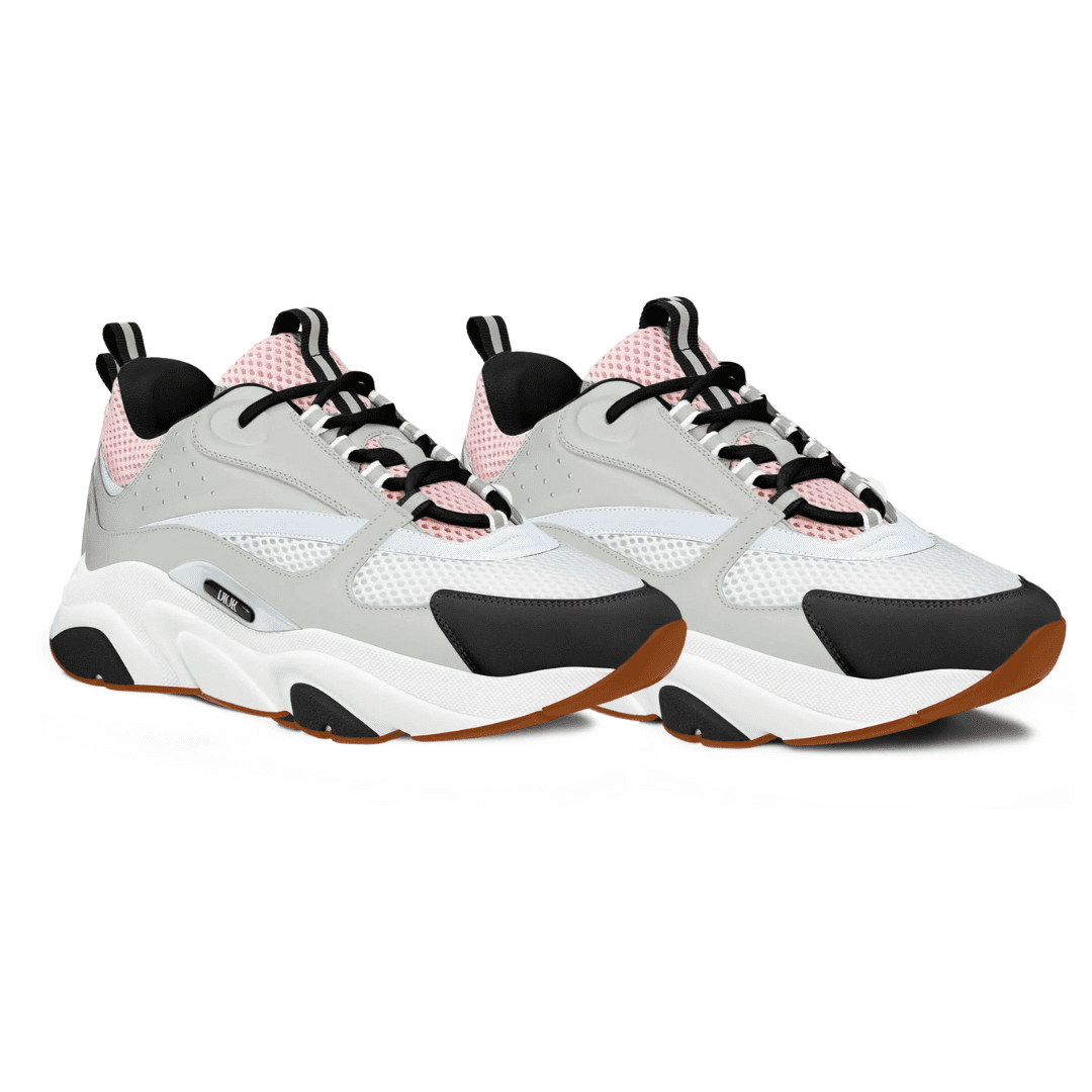 The Dior B22 ‘Grey Pale Pink’ blends soft tones with a sporty silhouette. Featuring a mix of grey mesh, white leather, and black suede overlays with pale pink accents, the sneaker is set on a chunky cream and gum sole. It perfectly captures Dior’s fusion of retro design and modern streetwear elegance.