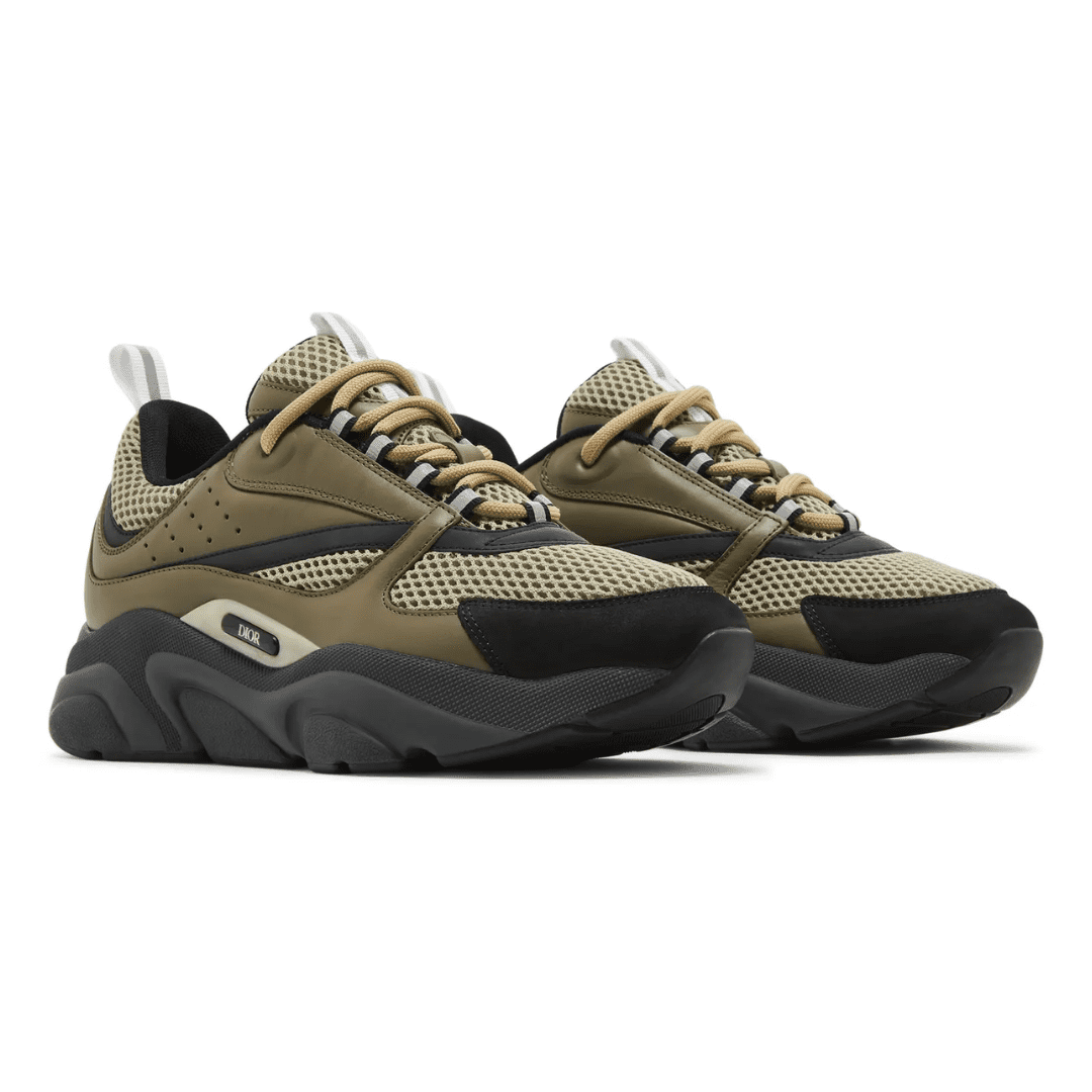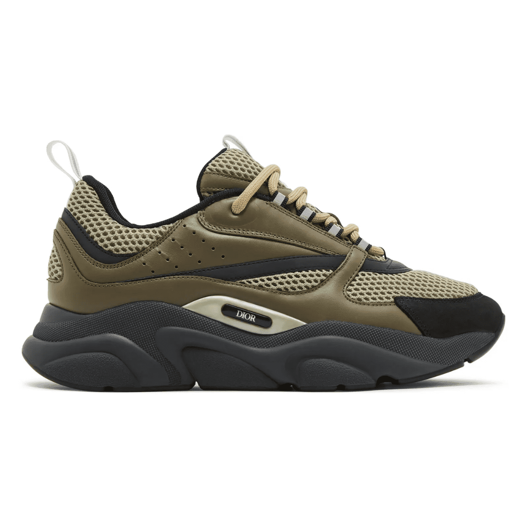The Dior B22 ‘Khaki’ delivers a rugged yet refined aesthetic with its earthy tones and bold silhouette. Crafted from a mix of khaki mesh, brown leather, and black suede, it sits atop a chunky black midsole for a modern, athletic finish — embodying Dior’s balance of luxury craftsmanship and streetwear edge.