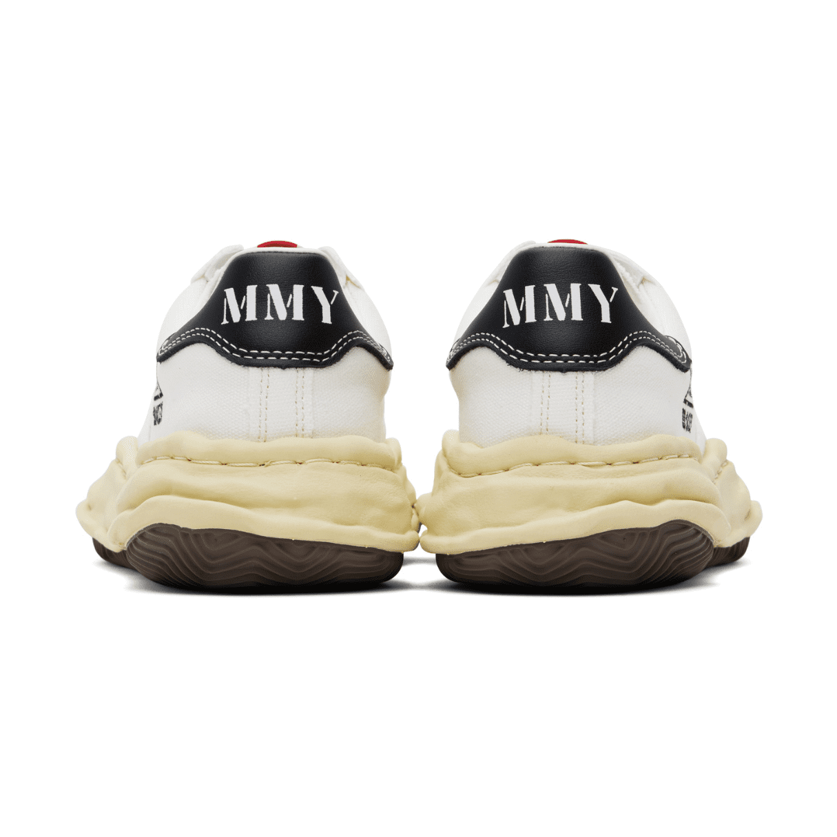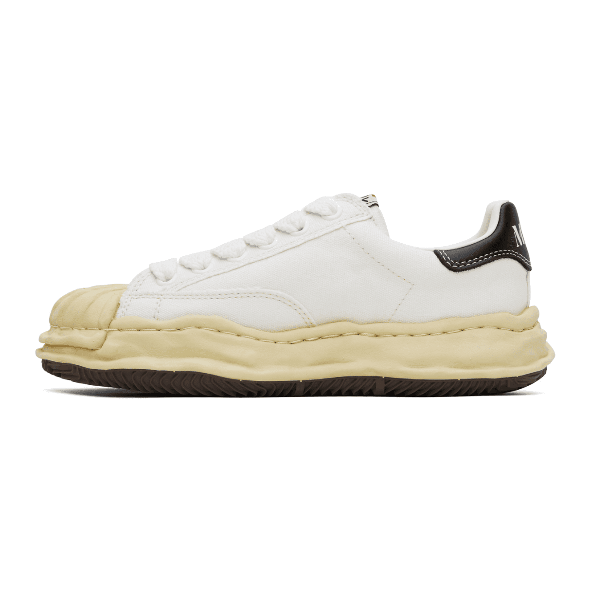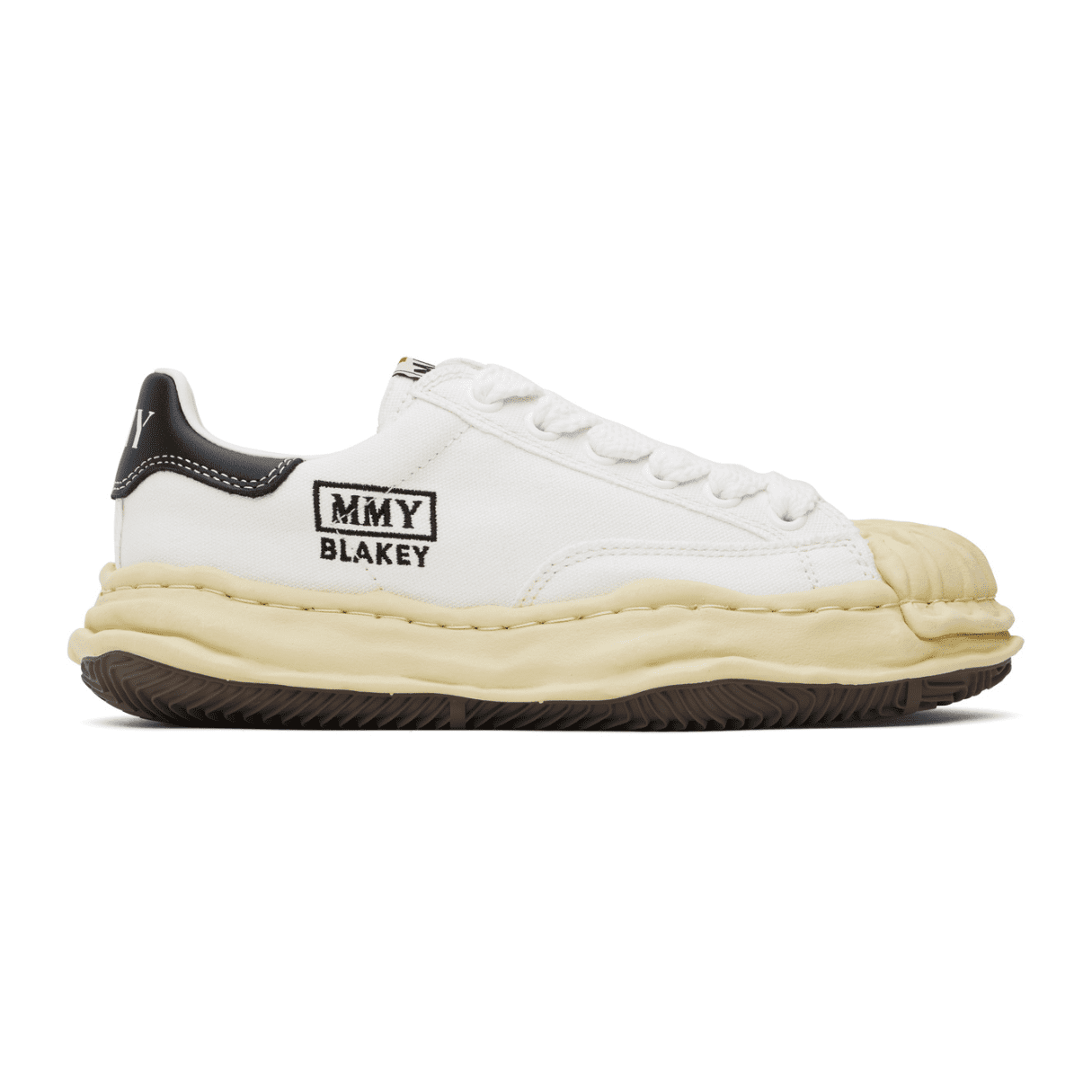 Maison Mihara Yasuhiro Blakey OG Sole Vintage Canvas Low ‘White’ is a unisex low-top with a washed canvas upper and MMY’s hand-molded “OG” wavy rubber sole. It features the sculpted foxing and bulbous toe cap, gold MMY “BLAKEY” stamp at the quarter, contrast heel tab, woven tongue label, and a grippy gum outsole. Vintage finish for a worn-in look.