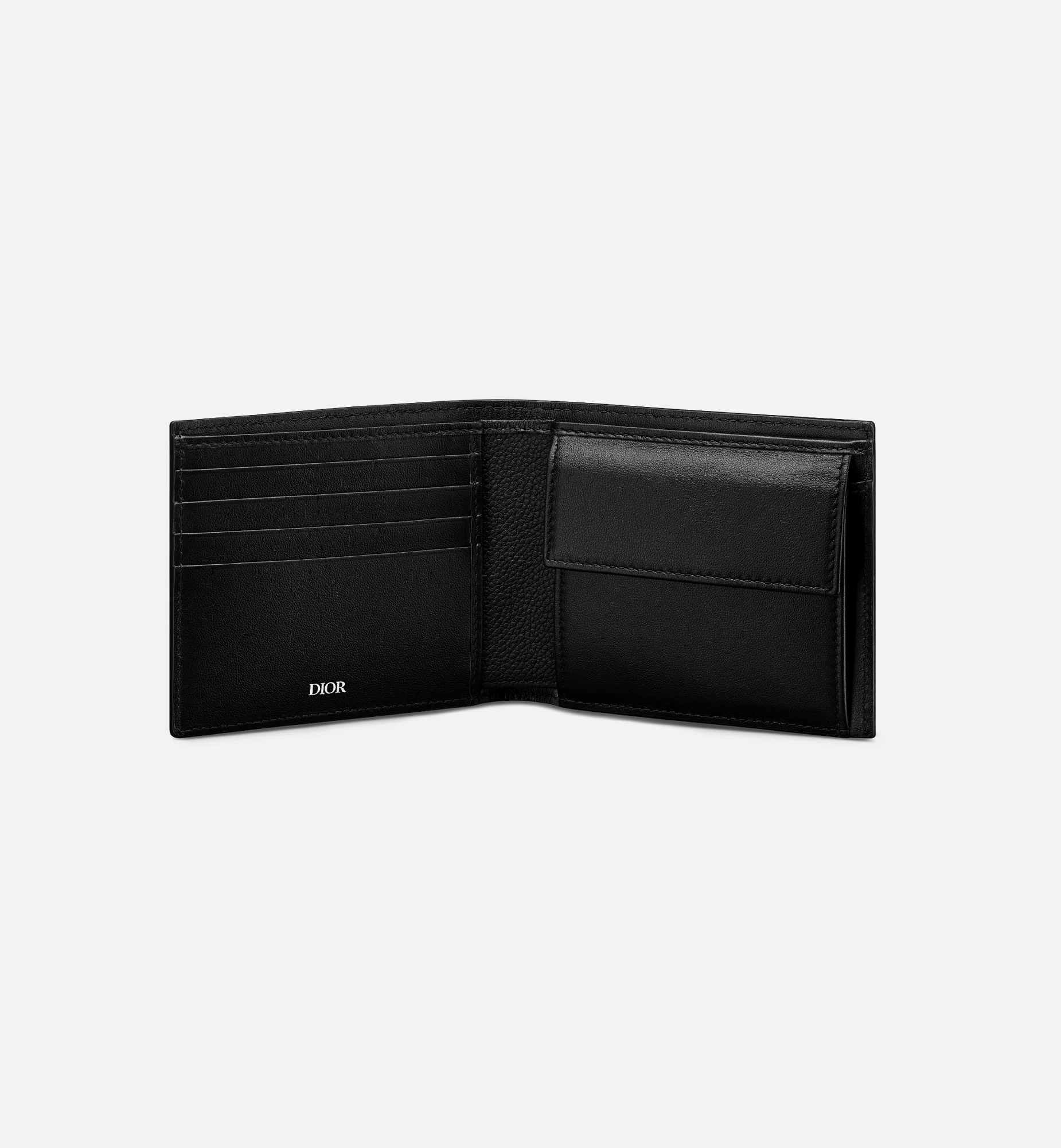 The bifold wallet is a refined, compact accessory. Displaying the virtuosity of the House ateliers, Dior Gravity leather showcases the iconic motif delicately embossed on black calfskin. The interior features a double bill compartment, two slip pockets for receipts, four card slots as well as a gusset compartment for coins secured by a snap closure. The bifold wallet will fit easily into any pocket or bag.