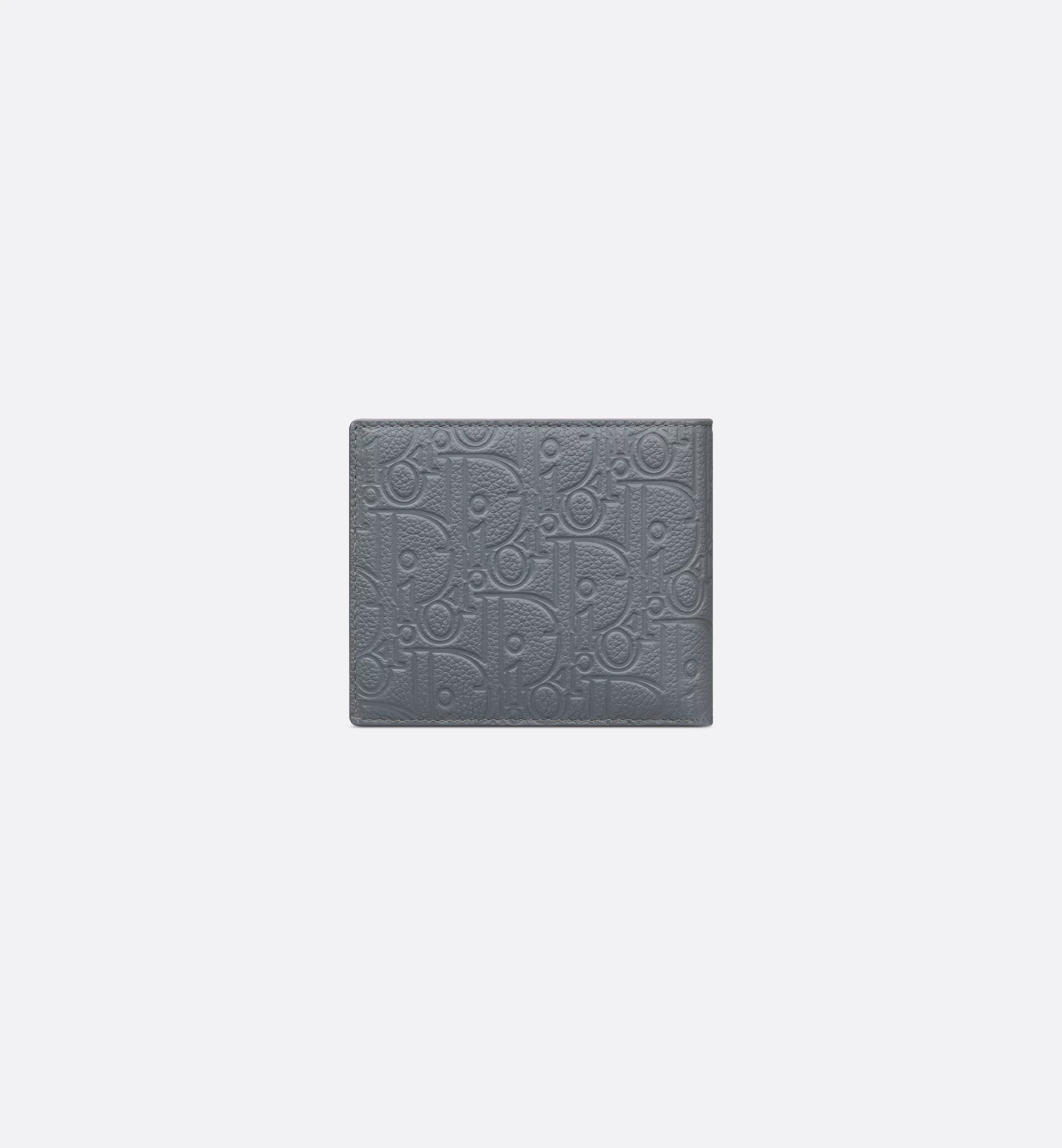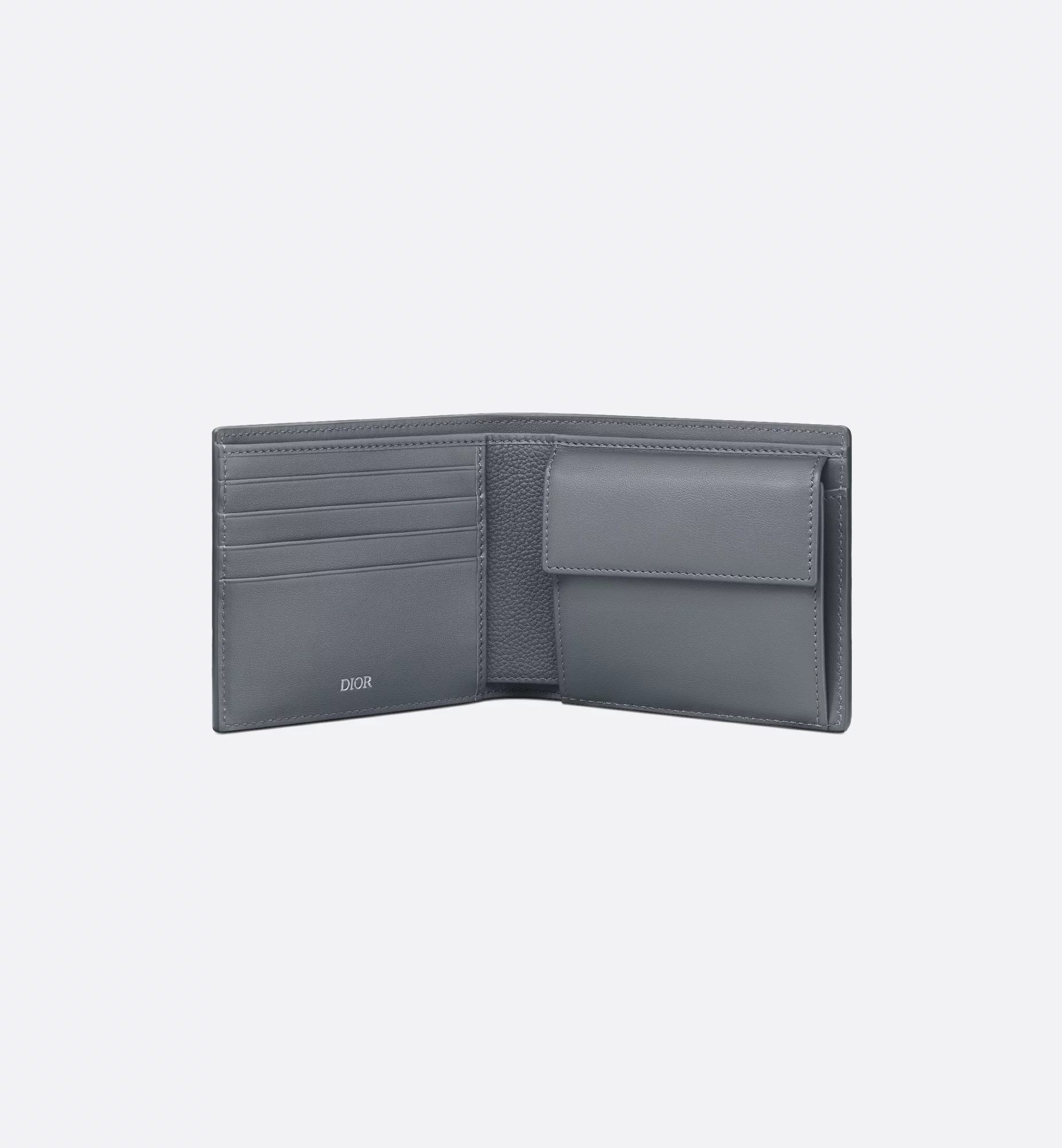 The bifold wallet is a compact refined accessory. Displaying the virtuosity of the House ateliers, the Dior Gravity leather showcases the iconic motif delicately embossed on deep gray calfskin. The tonal smooth calfskin interior features a double bill compartment, two slip pockets for receipts, four card slots as well as a gusseted snap compartment for coins. The bifold wallet will fit easily into any pocket or bag.