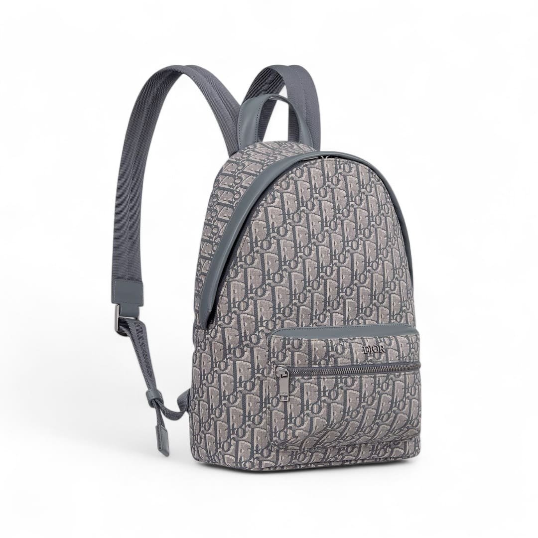 The Rider backpack has a pared-down silhouette, reminiscent of a classic school backpack. Inspired by Dior Men, the design this season is offered in deep gray jacquard covered with the hallmark Dior Oblique motif. Its two-way zip closure, wide zip pocket on the front and adjustable padded straps are other key details that make this an essential bag for kids.