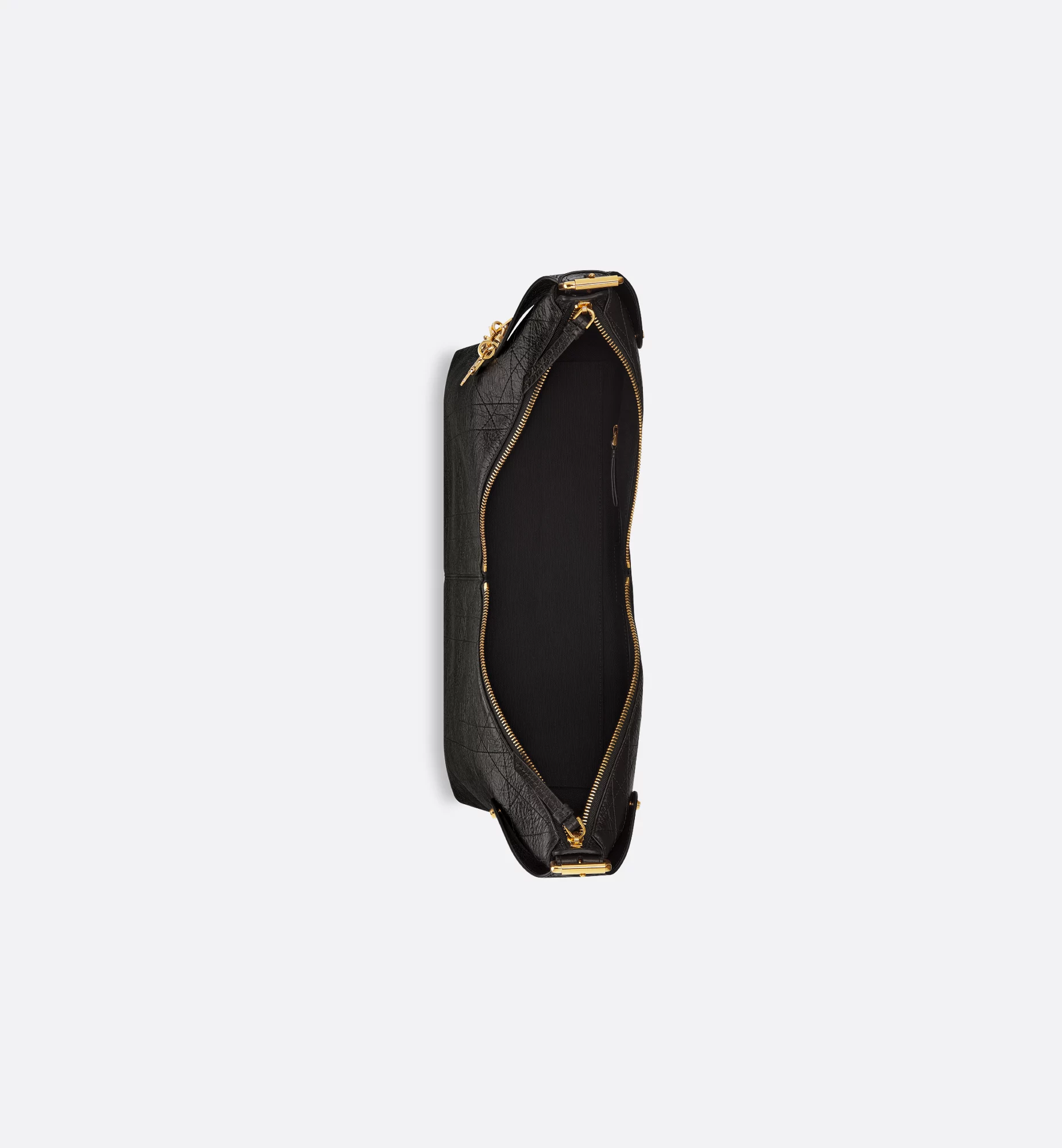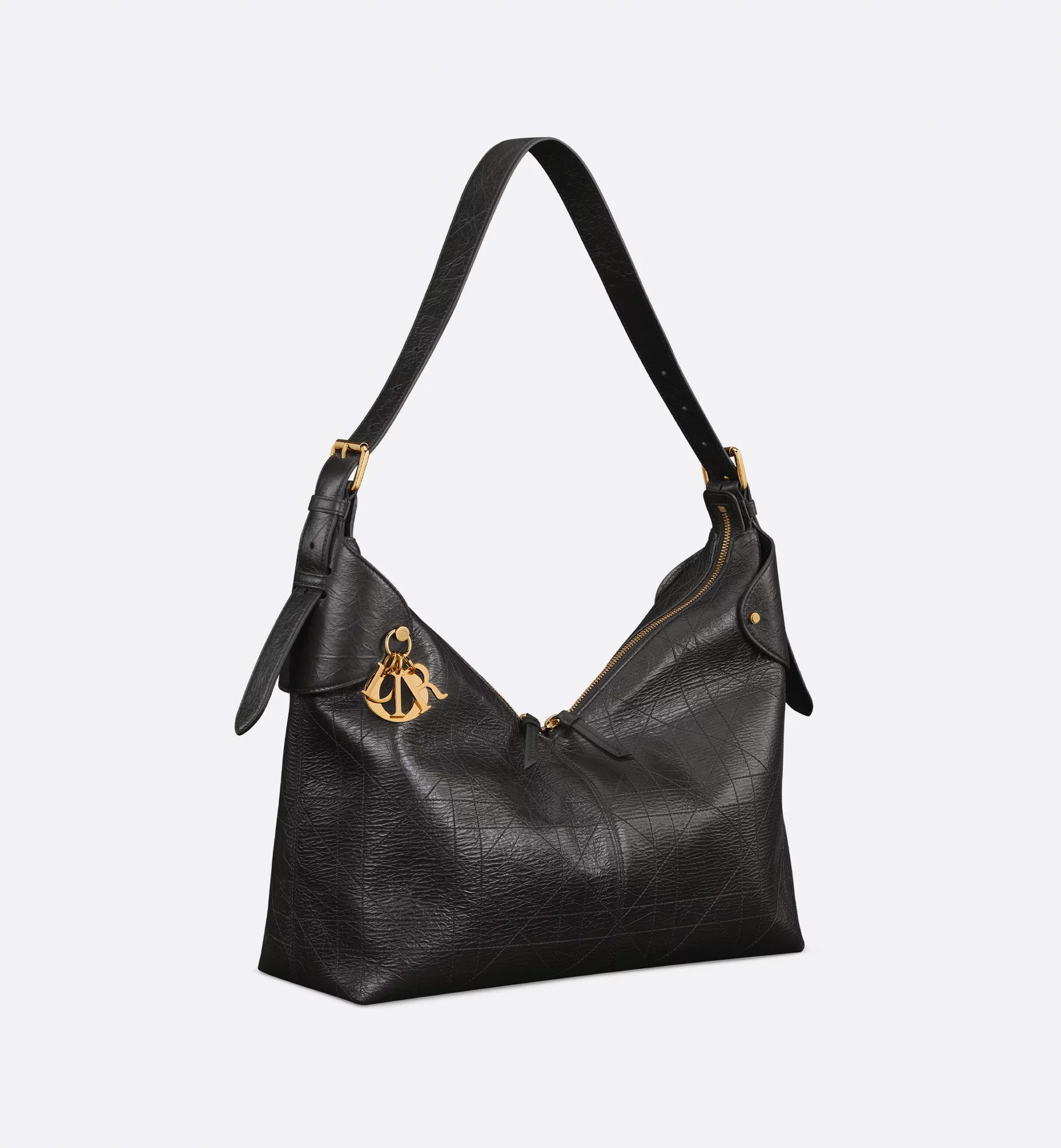 New for Cruise 2026, the Dior Voyage bag combines soft lines with sophisticated details for a harmonious hobo silhouette. The black crinkled calfskin leatherwork showcases Flat Macrocannage topstitching in an interpretation of the House’s iconic motif. The supple construction is enhanced by antique gold-finish metal D.I.O.R. charms and finely crafted leather accents for added structure, while the main compartment has a secure and practical two-way zip closure. Featuring a top handle with adjustable buckles, the large bag can be worn over the shoulder as a daily companion.