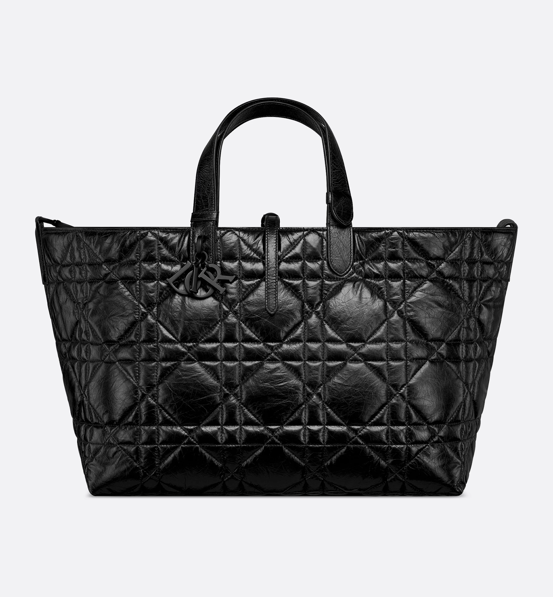 The Dior Toujours bag is distinguished by a casual and practical design. Crafted in black crinkled calfskin with Macrocannage topstitching, it showcases a spacious interior compartment with a matching pouch to organize the essentials. Its thin leather strap closure keeps items secure while the D of the CD Lock clasp twists to alter the sides and enhance the bag’s silhouette. The leather handles can be adjusted using the small notches in order to be able to carry the large bag by hand or wear it over the shoulder.