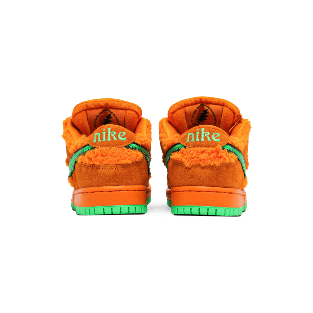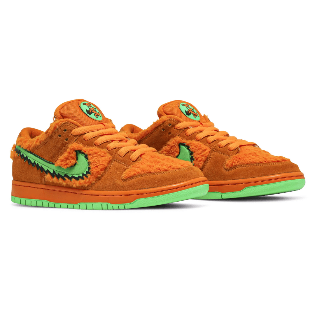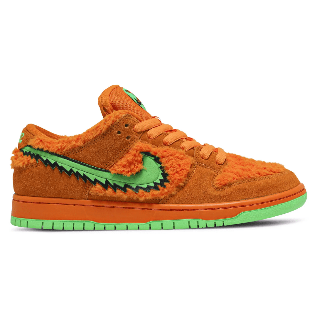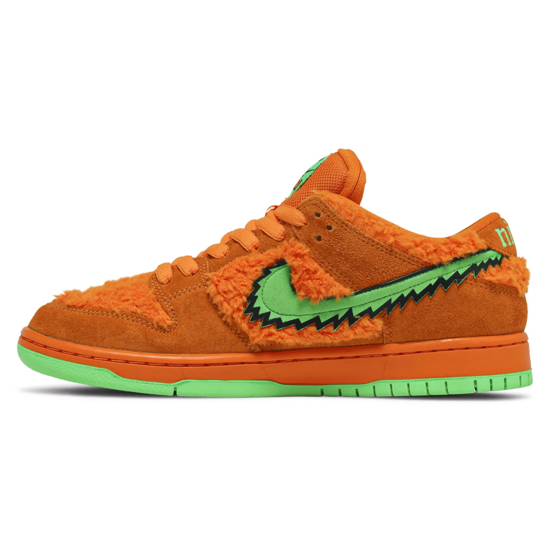 Launching in collaboration with the legendary jam band, the Grateful Dead x Nike Dunk Low SB ‘Orange Bear’ features an ursine design theme inspired by the back cover of the 1973 live album, ‘History of the Grateful Dead, Volume One (Bear’s Choice).’ The low-top makes use of a furry orange upper, overlaid with tonal suede paneling and accented with a bright green Swoosh outlined in bold jagged lines. A bear graphic adorns the tongue, equipped with a hidden stash pocket.