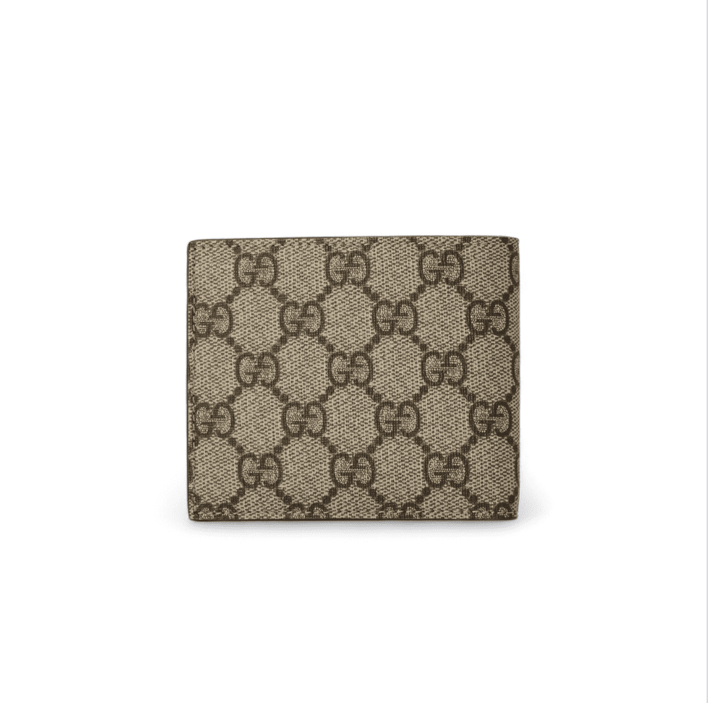 This Gucci GG Brown Interior Bi-Fold Wallet, made from refined beige and ebony GG Supreme canvas, combines design with practical functionality. The designer men’s billfold showcases sleek ceramic-effect brass hardware, adding a contemporary touch to this Italian-made accessory, perfect for both important business meetings and casual weekend outings.