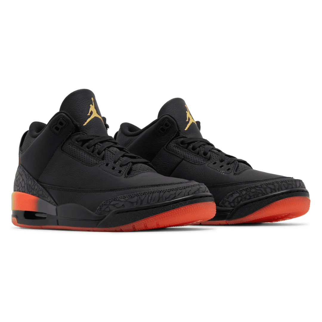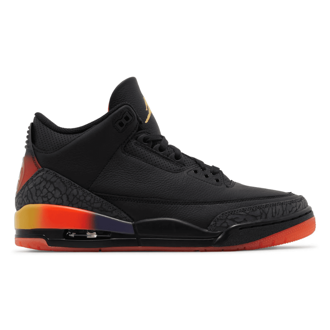 The J Balvin x Air Jordan 3 Retro ‘Rio’ takes its name from the reggaeton artist’s son. The legacy silhouette carries a black leather upper with grey elephant print overlays at the forefoot and heel. Gradient accents in Solar Flare and Total Crimson Abyss coat the back tab, marked with Nike Air branding on the left foot and J Balvin’s smiley face logo on the right. The sunset colors are repeated on the rear of the polyurethane midsole, supported by a red-tinged translucent rubber outsole.