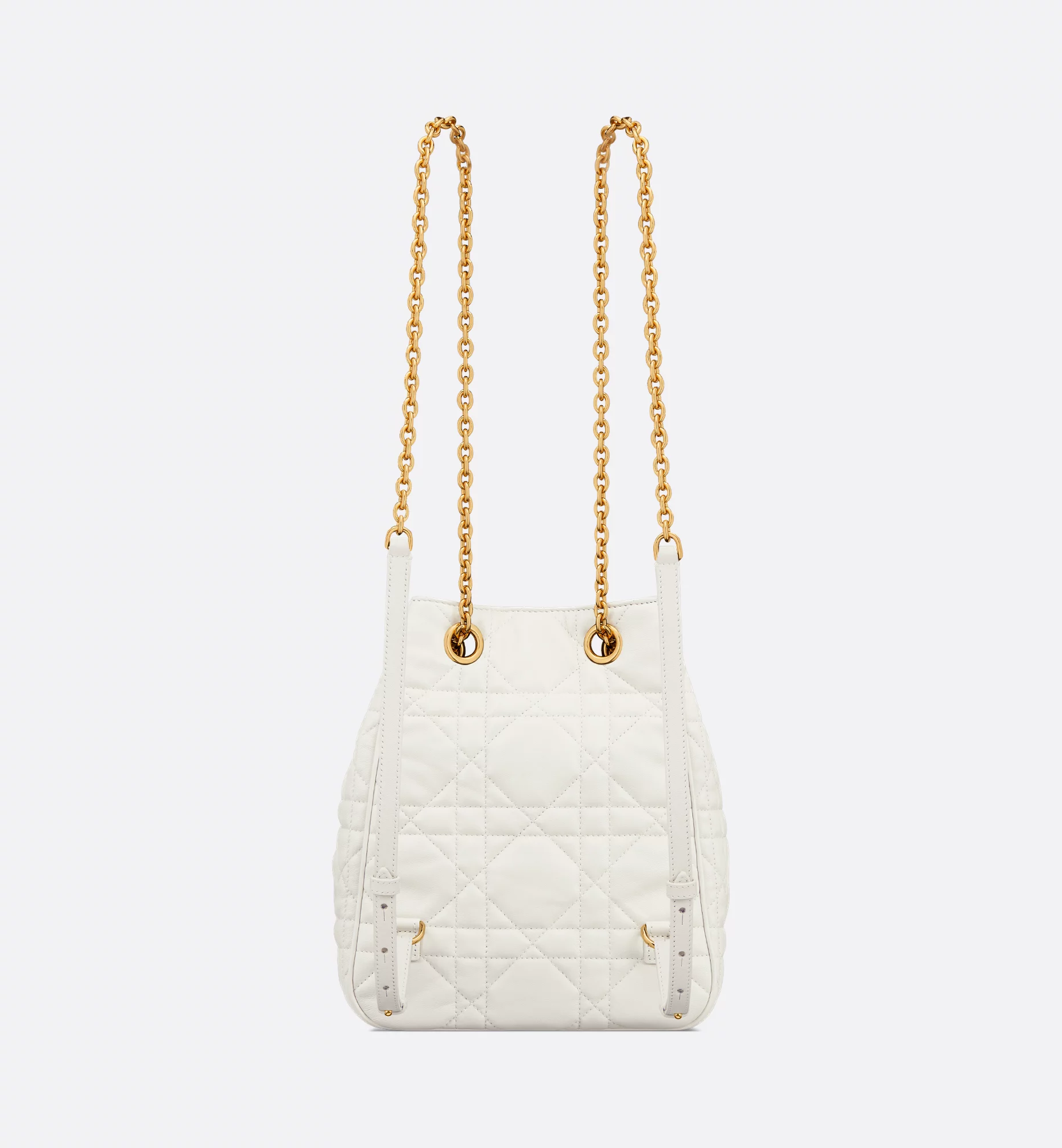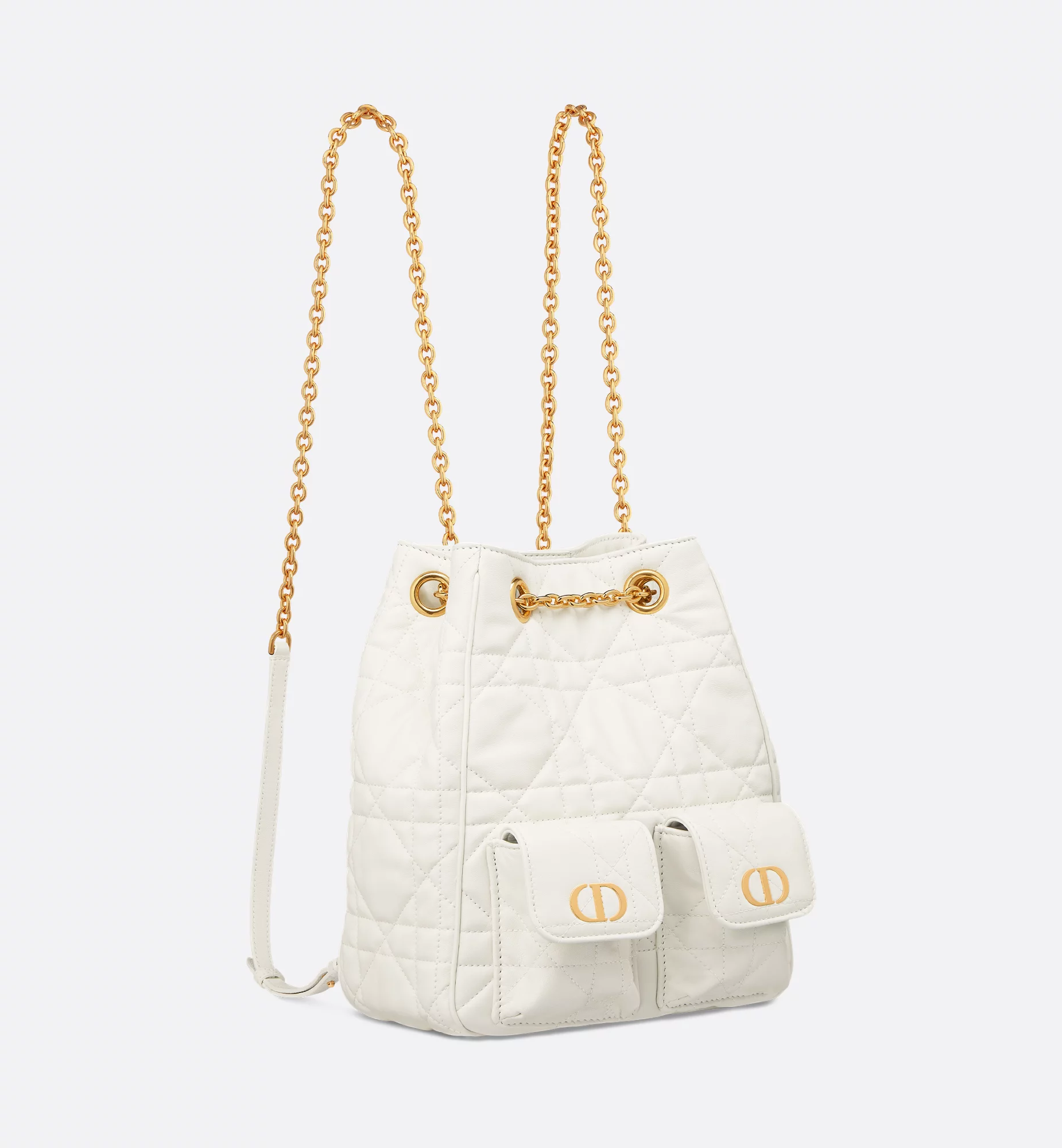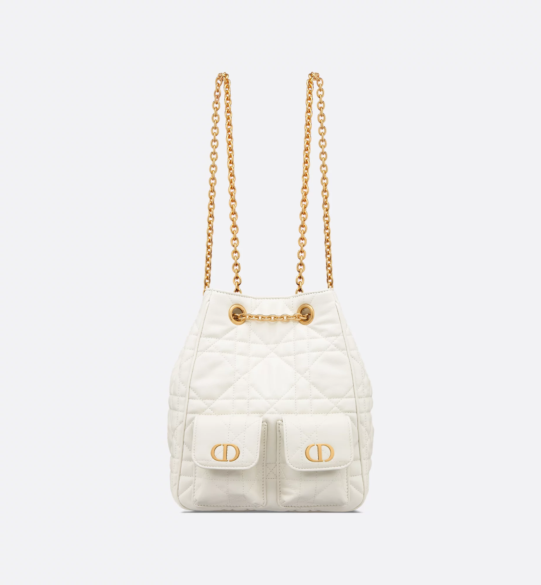 New for Winter 2025, the Dior Caro Multicarry backpack embodies modern and elegant style. Crafted in latte lambskin with Macrocannage topstitching, the versatile creation stands out with a streamlined silhouette that opens to reveal a spacious main compartment with a magnetic closure, completed by two small flap pockets adorned with a gold-finish metal CD signature on the front. Featuring a chain with a sliding design and leather inserts, the medium bag can be carried comfortably as a backpack or worn over the shoulder using the double chain strap.