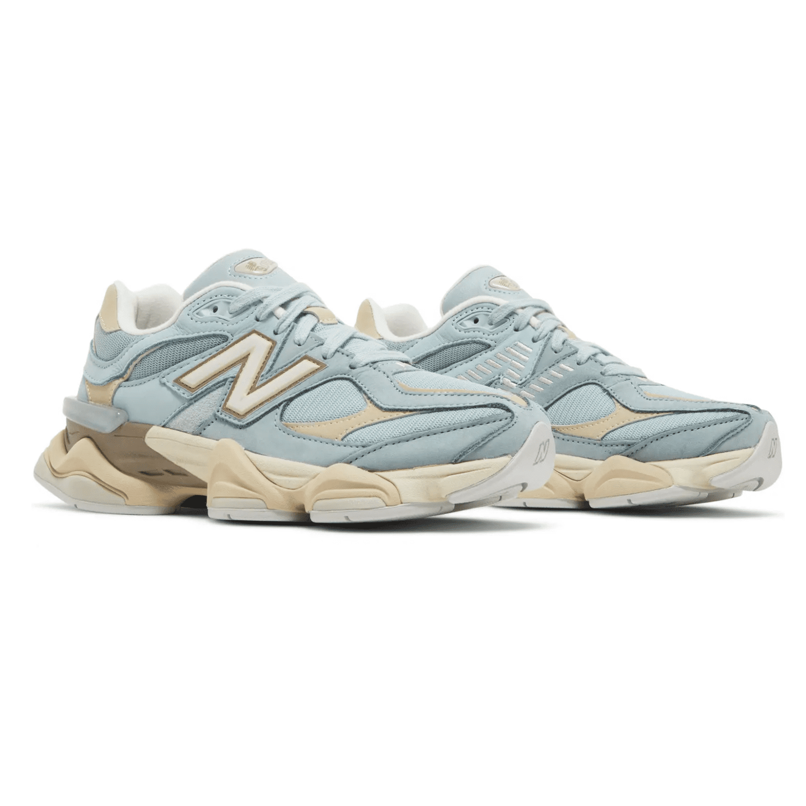 The New Balance 9060 ‘Blue Haze’ combines a mesh base in a pastel blue finish with tonal leather and suede overlays. Tan synthetic leather detailing reinforces the forefoot and heel, while a transparent CR device at the heel delivers rearfoot stability. Muted cream and brown shades are applied to a stacked ABZORB midsole with SBS cushioning in the heel. Underfoot, a diamond-pattern rubber outsole yields durable traction.