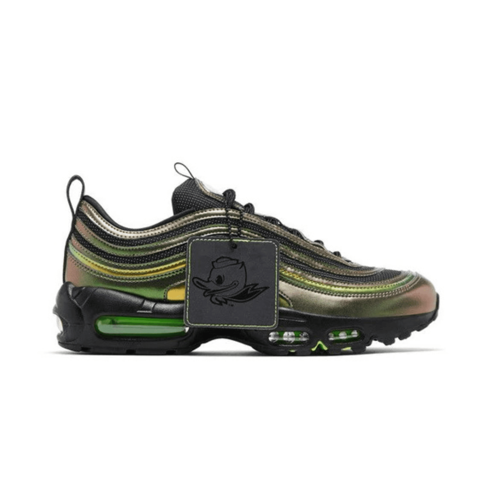 Created by Division Street’s Ducks of a Feather, the Air Max 95/97 ‘University of Oregon – Storm’ PE embodies the unique elements of the Pacific Northwest. Honoring the region’s natural beauty, the AM97 upper pairs metallic green-bronze overlays with two-tone reflective mesh underlays. A golden textile sits at the midfoot panel, punctuated by a mini Swoosh. Dark jade branding lands on the rear pull tab. Lenticular Nike and DOAF labels arrive on the tongue tags. The sockliners, emblazoned with mismatched Oregon motifs across the left and right inserts, are covered in a triangle pattern recalling the school’s football uniforms. The AM95’s signature molded midsole is outfitted with visible Air windows and neon green pillars. Underfoot, the spine bears the university’s “O” logo.