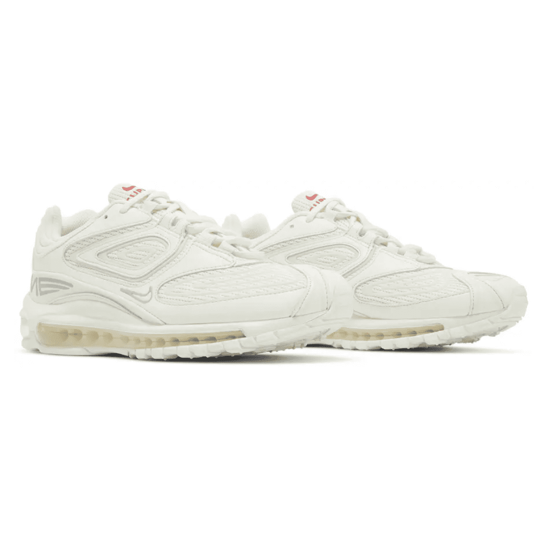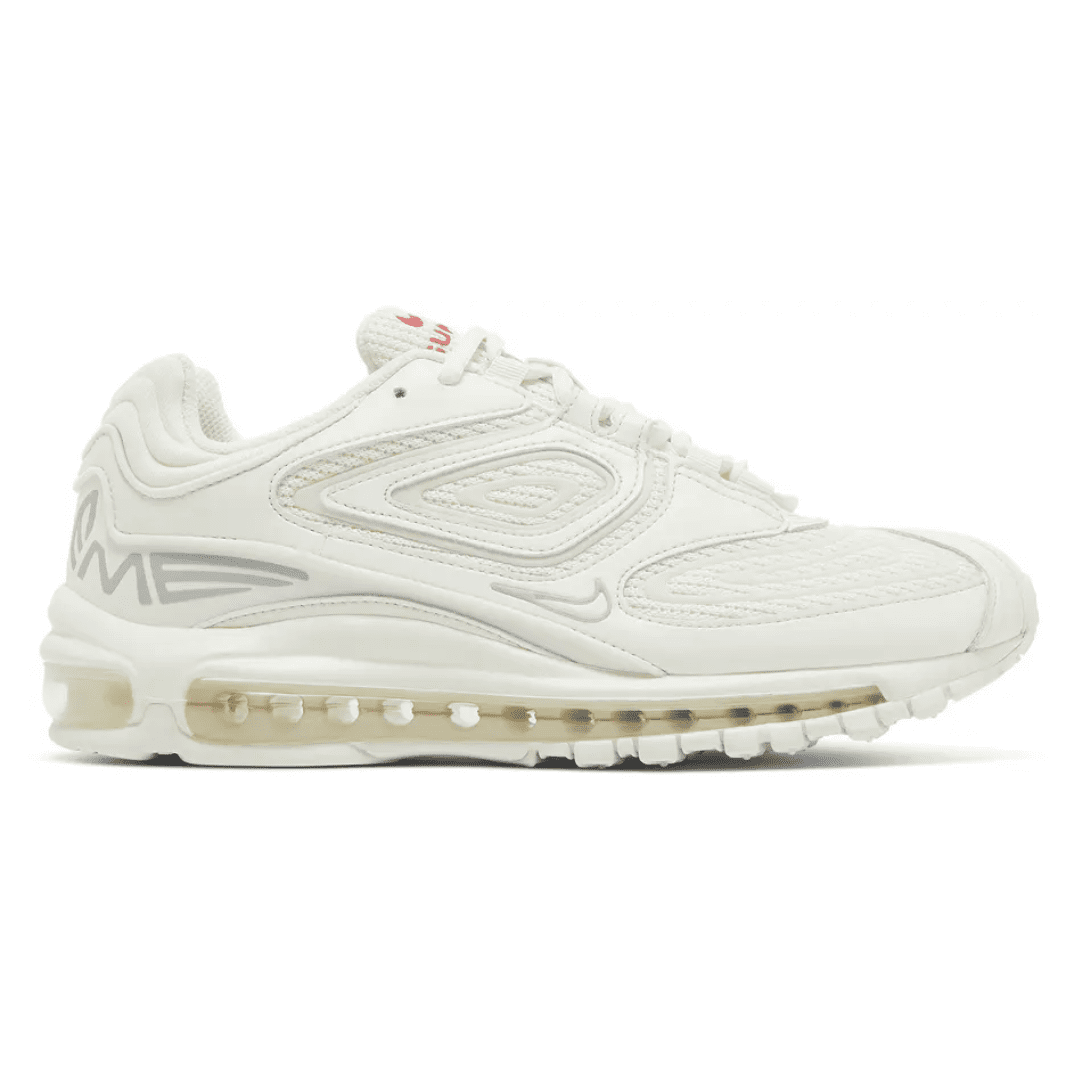 Launching as part of an exclusive four-piece pack, the Supreme x Nike Air Max 98 TL SP ‘White’ treats the vintage running shoe to a blank-slate makeover. Reflective laces secure the modified upper, composed of breathable white mesh with tonal overlays in TPU and synthetic leather. 3M accents land on a lateral-side Swoosh and an oversized Supreme wordmark on the back heel, while dual Swoosh and Supreme branding adorns the tongue in contrasting hits of crimson. Lightweight cushioning comes courtesy of a Max Air unit that runs the length of the rubber outsole.