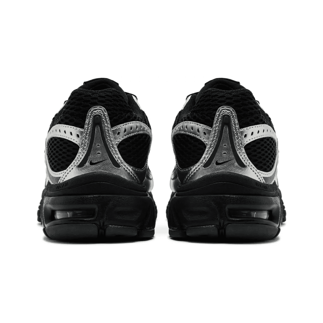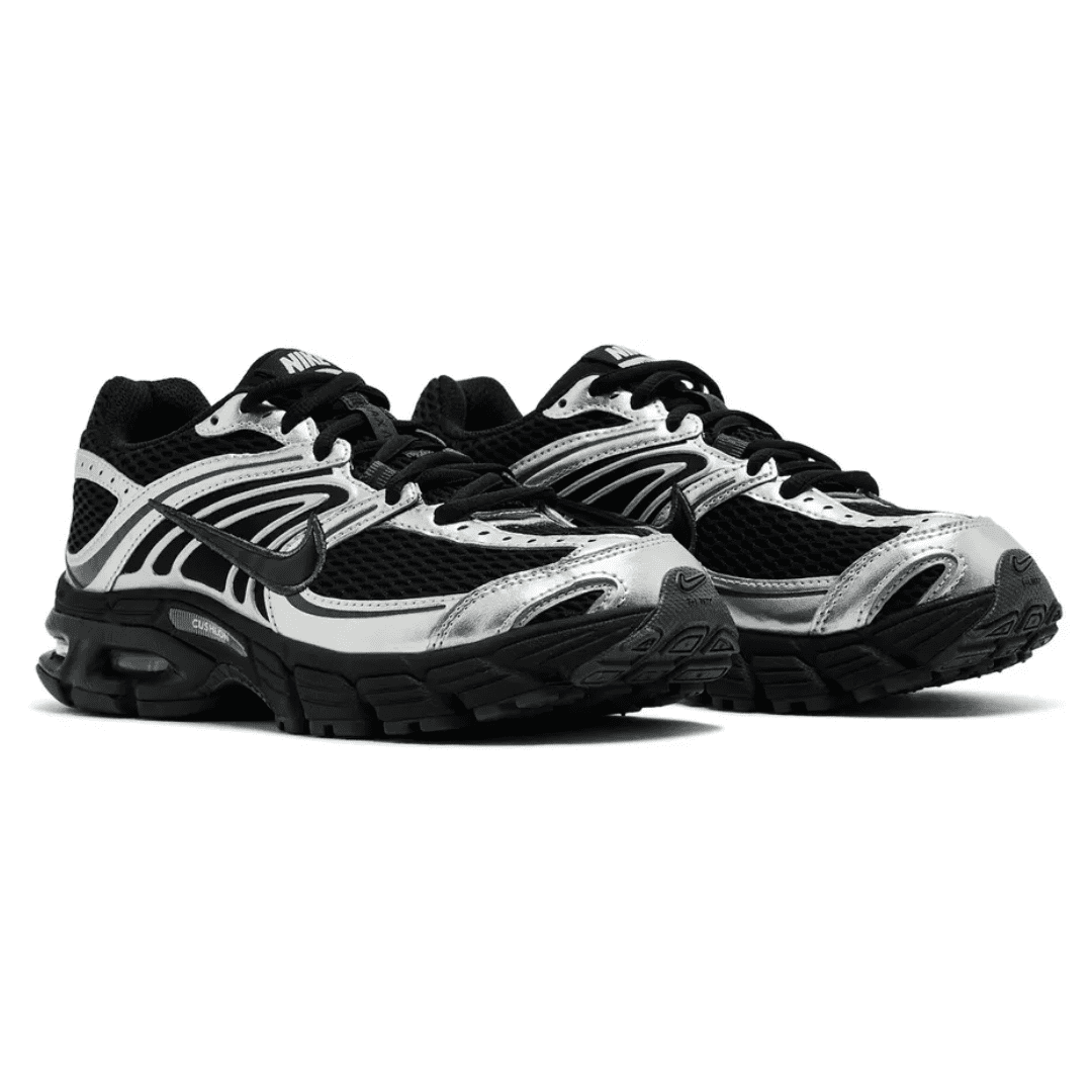 The Nike Women’s Air Max Moto 2K ‘Black Metallic Silver’ delivers a modern interpretation of the Air Max Moto+ 6 from 2008. Breathable black mesh is utilized on the upper, bolstered with arcing synthetic leather overlays in a gleaming metallic silver finish. Reflective detailing at the toe and heel offers enhanced visibility in low-light conditions. The sneaker rides atop a sculpted Cushlon midsole, painted black and fitted with visible Max Air cushioning in the heel.