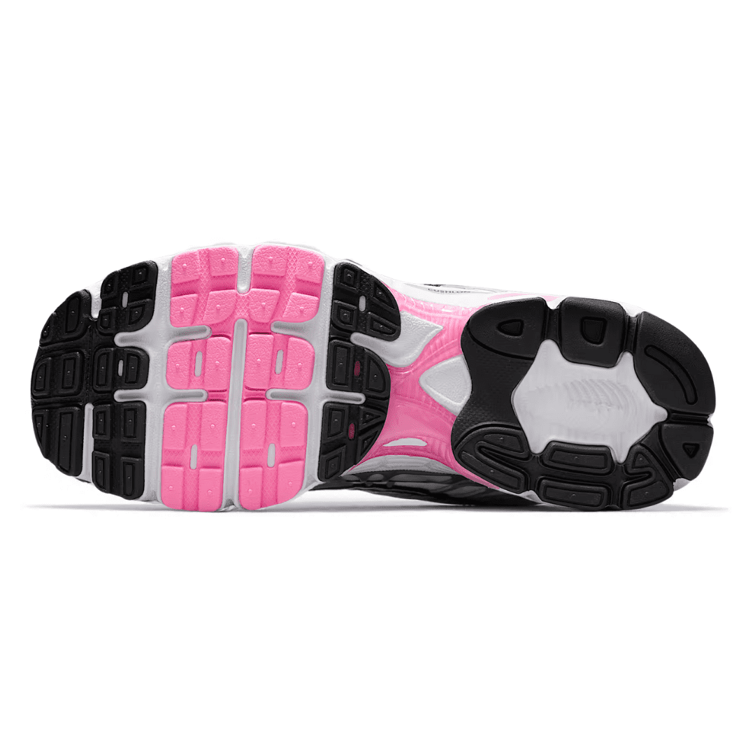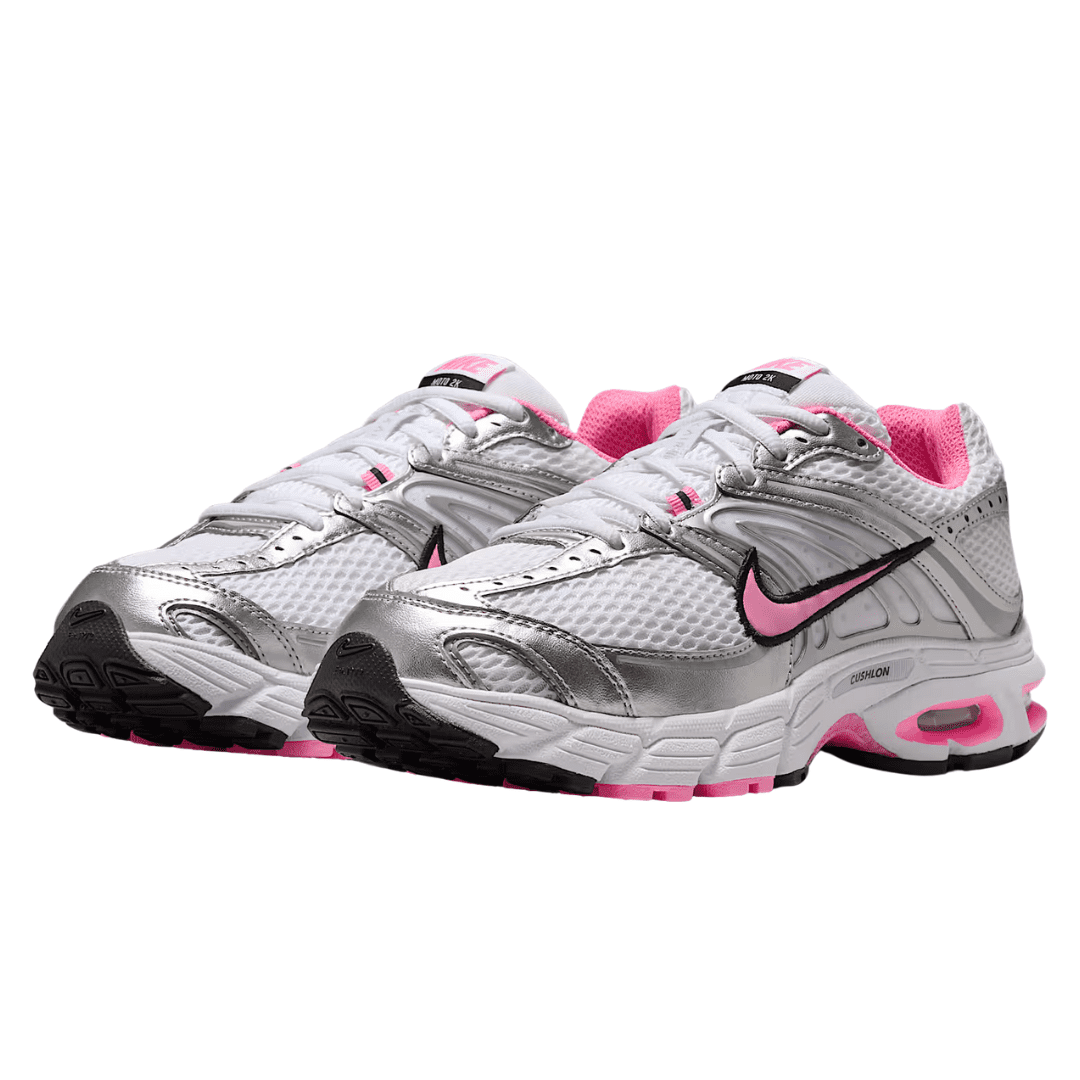 The Nike Women’s Air Max Moto 2K ‘White Pink Spell’ showcases candy-bright accents on a lifestyle runner based on the Air Max Moto+ 6 from 2008. The upper combines airy white mesh with synthetic leather overlays in metallic silver. The textile collar lining is rendered in a vibrant pink hue, matching the signature Swoosh and midfoot webbing eyelets. Additional pink accents make their way to the rubber outsole, as well as the borders that outline the Max Air units nestled in the heel of the Cushlon midsole.