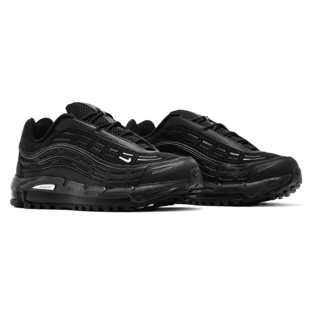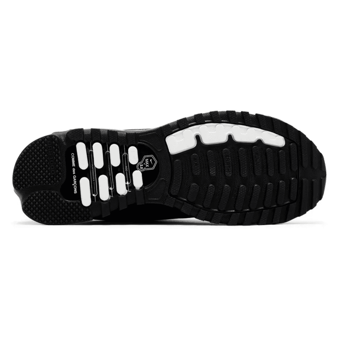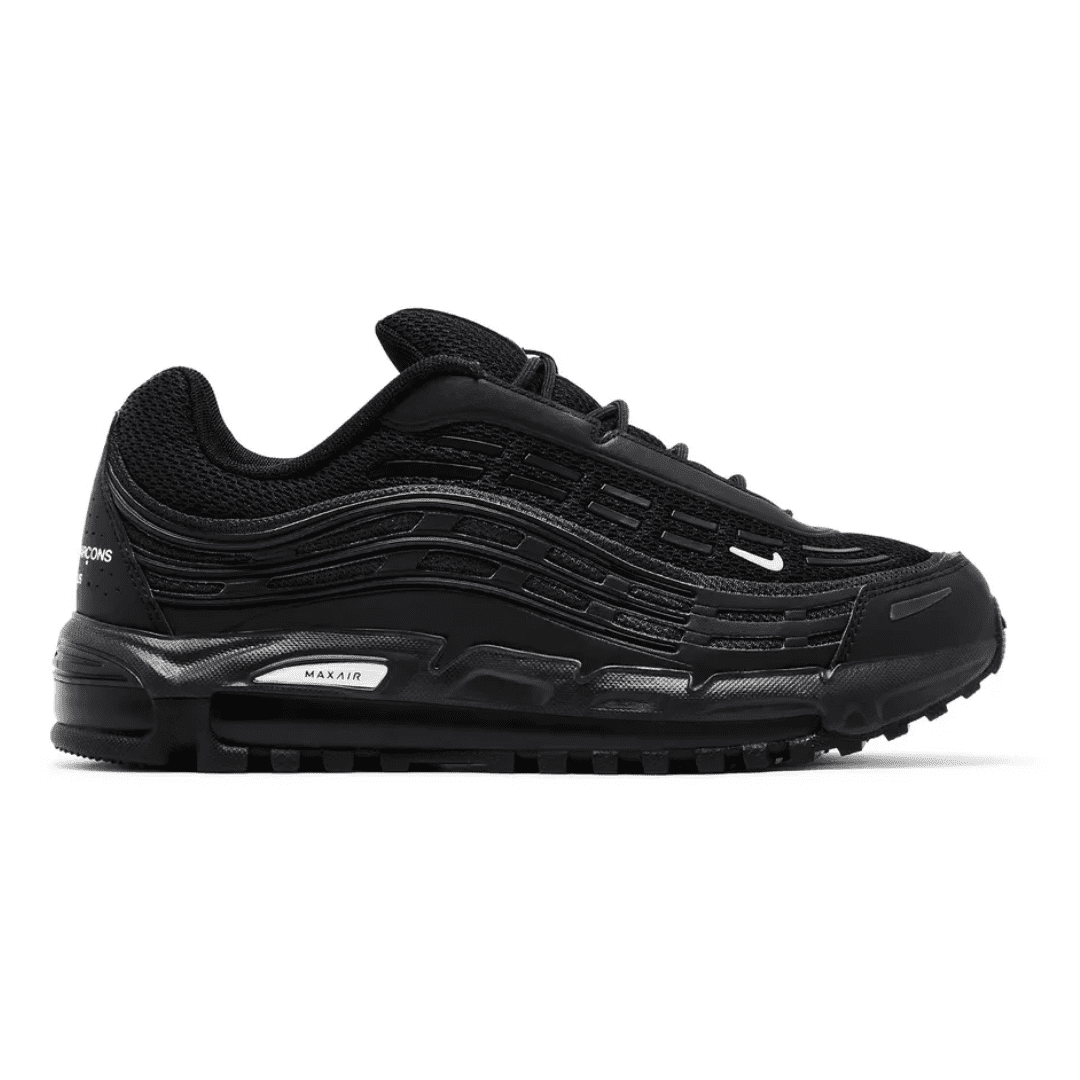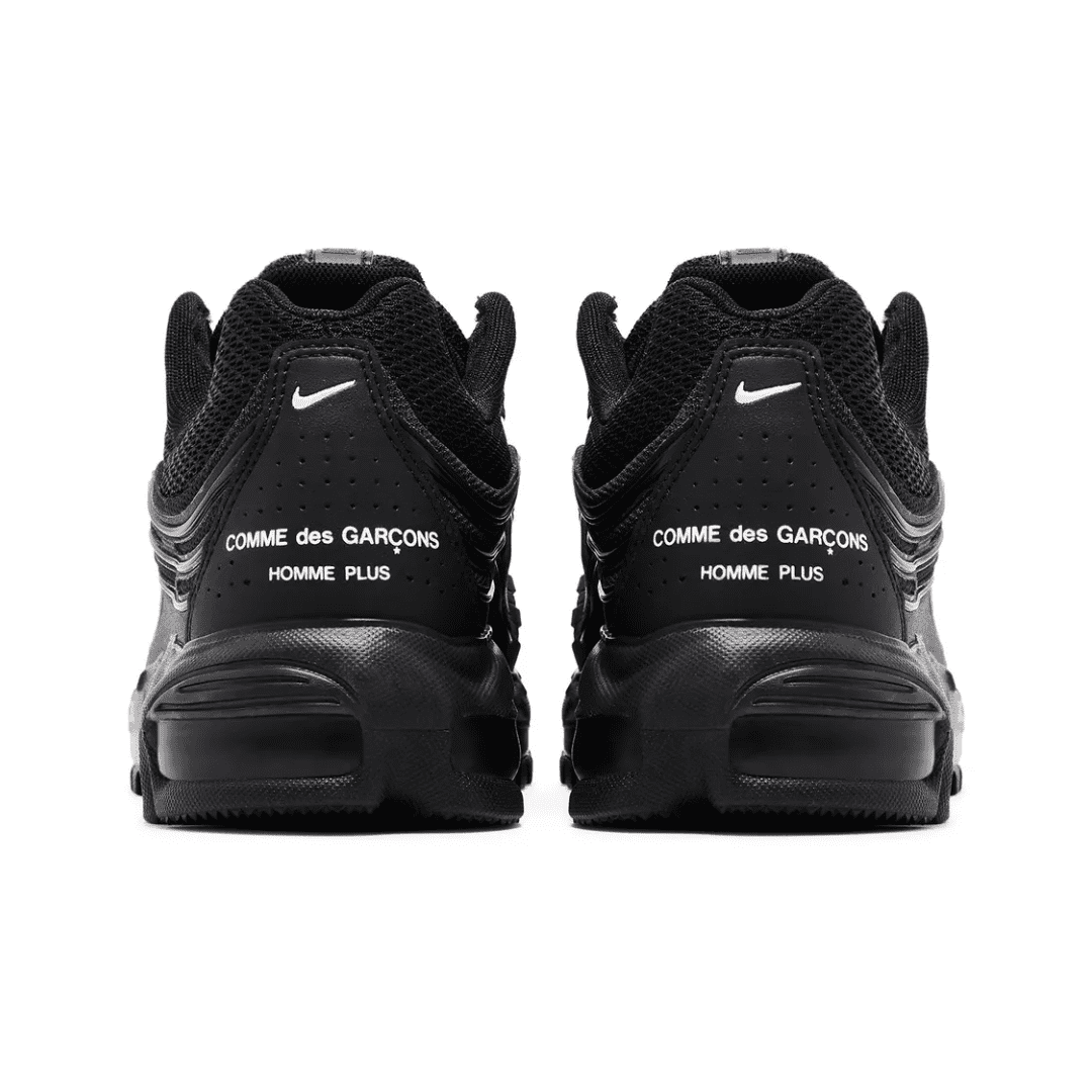 The Comme des Garçons Homme Plus x Nike Air Max TL 2.5 ‘Black’ brings back the retro running shoe in a sleek one-note design. The upper combines breathable black mesh with tonal overlays in durable synthetic leather. The monochrome design is disrupted by contrasting white branding elements, including a white mini-Swoosh on the lateral forefoot and ‘Comme des Garçons Homme Plus’ printed on the heel overlay. The sneaker is mounted on a matching black foam midsole, featuring full-length Air-sole cushioning.