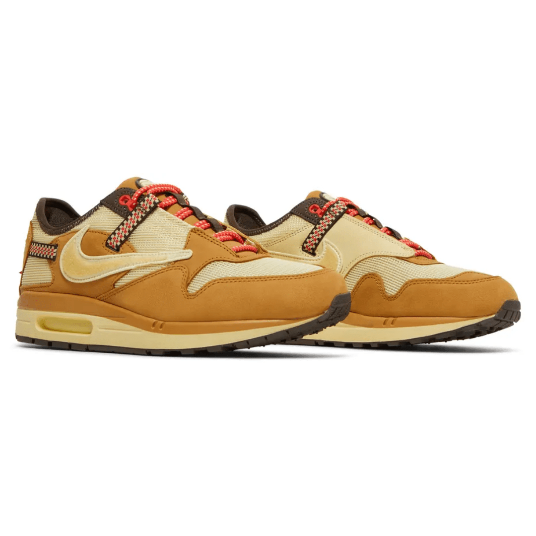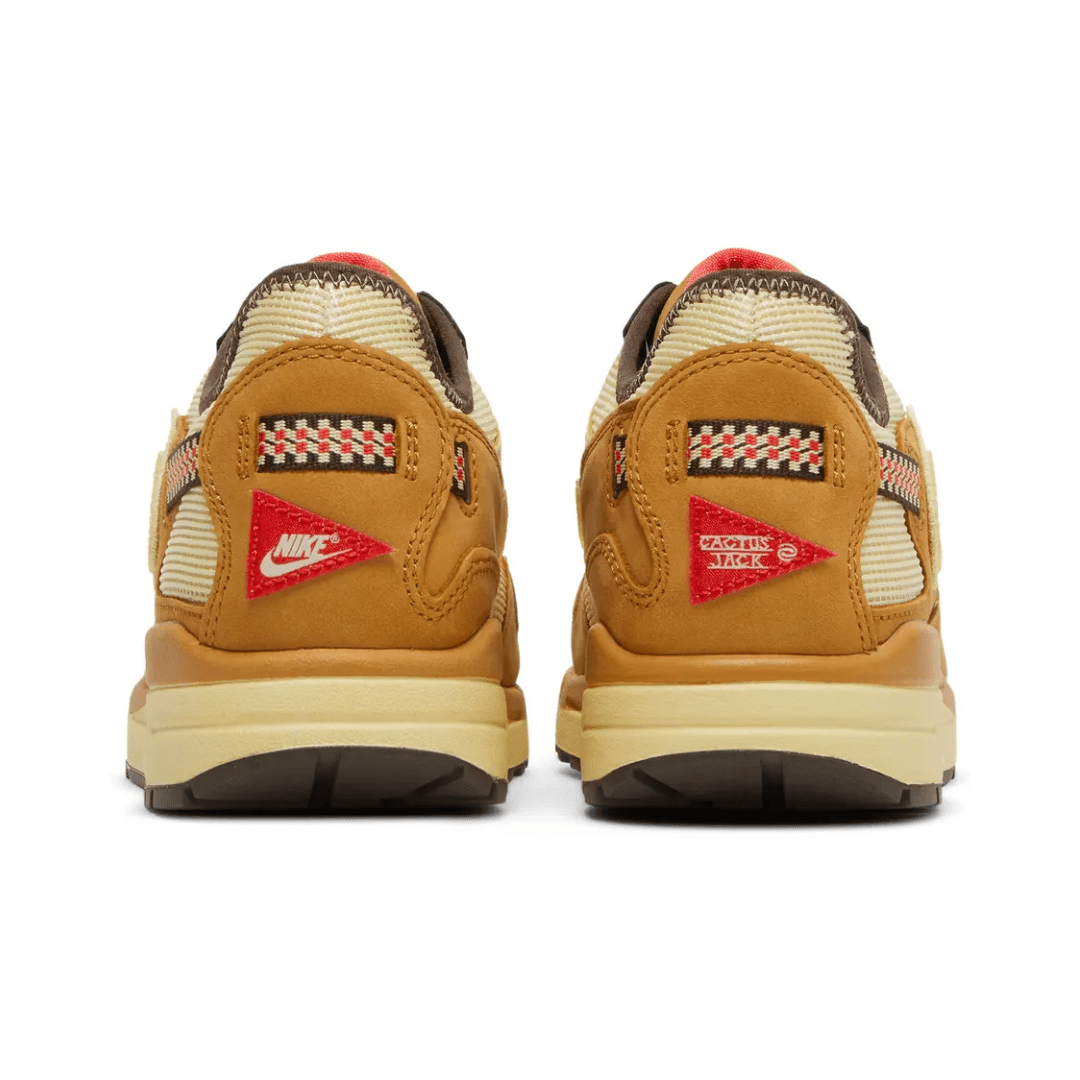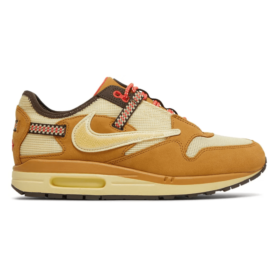 Originally slated as a friends-and-family colorway, the Travis Scott x Nike Air Max 1 ‘Wheat’ updates the heritage running shoe with warm earth tones and the Houston rapper’s signature reverse Swoosh. Red rope laces secure a modified upper constructed from cream-colored mesh with tan nubuck overlays and multicolor webbing straps inspired by the ACG Pocket Knife. Cactus Jack branding appears on the tongue, while a Nike pennant adorns the heel overlay. The sneaker rides on a two-tone foam midsole, supported by a brown rubber outsole with a revised waffled tread.