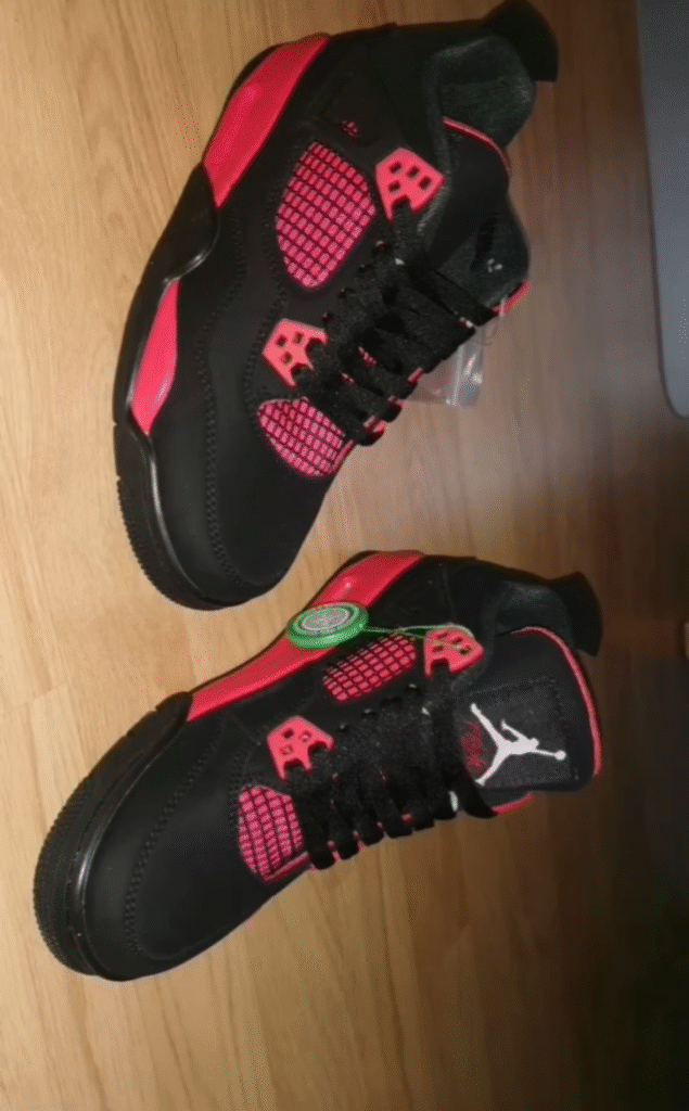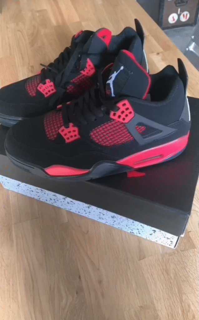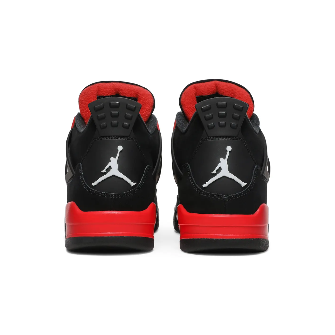 The Air Jordan 4 Retro ‘Red Thunder’, also known as ‘Crimson’, features familiar color blocking that recalls the coveted ‘Thunder’ colorway, originally released in 2006 and subsequently reissued in 2012. The mid-top sports a black nubuck upper with contrasting pops of crimson in lieu of the older shoe’s Tour Yellow accents. They appear on the sneaker’s molded eyelets, interior tongue, quarter panel, throat and midsole, which packs visible Air-sole cushioning under the heel. Jumpman branding decorates the tongue tag and heel.