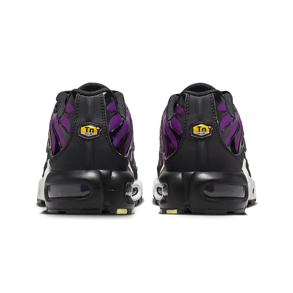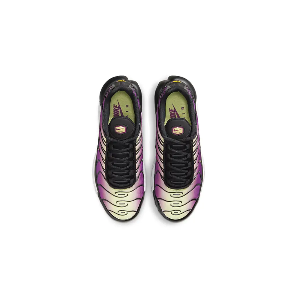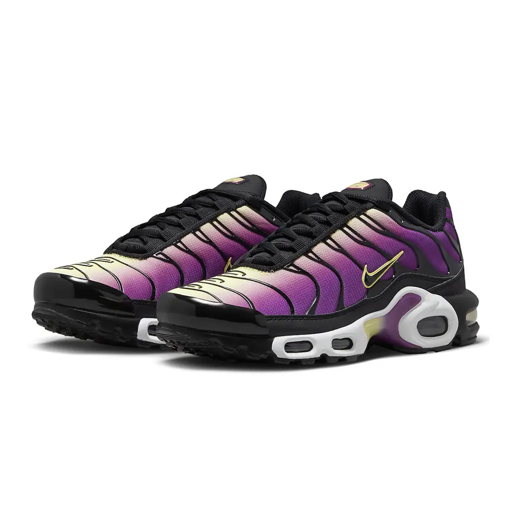 The Nike TN Air Max Plus Black Fuchsia Yellow has a striking design. The upper is made from breathable mesh and comes overlaid with dynamic black TPU caging that strategically hugs in your feet. Deep purple hits on the outer sides and bleeds over into bright fuchsia and creamy white along the eye stays and toe box. The Swoosh motif on the medial side introduces a touch of pale yellow that’s picked up again via the faceted outsole. To keep things focused on the ombré design, the laces come in plain black, just like the tongue, too, and are threaded through neat loops instead of eyelets.