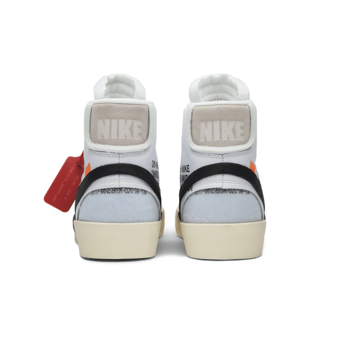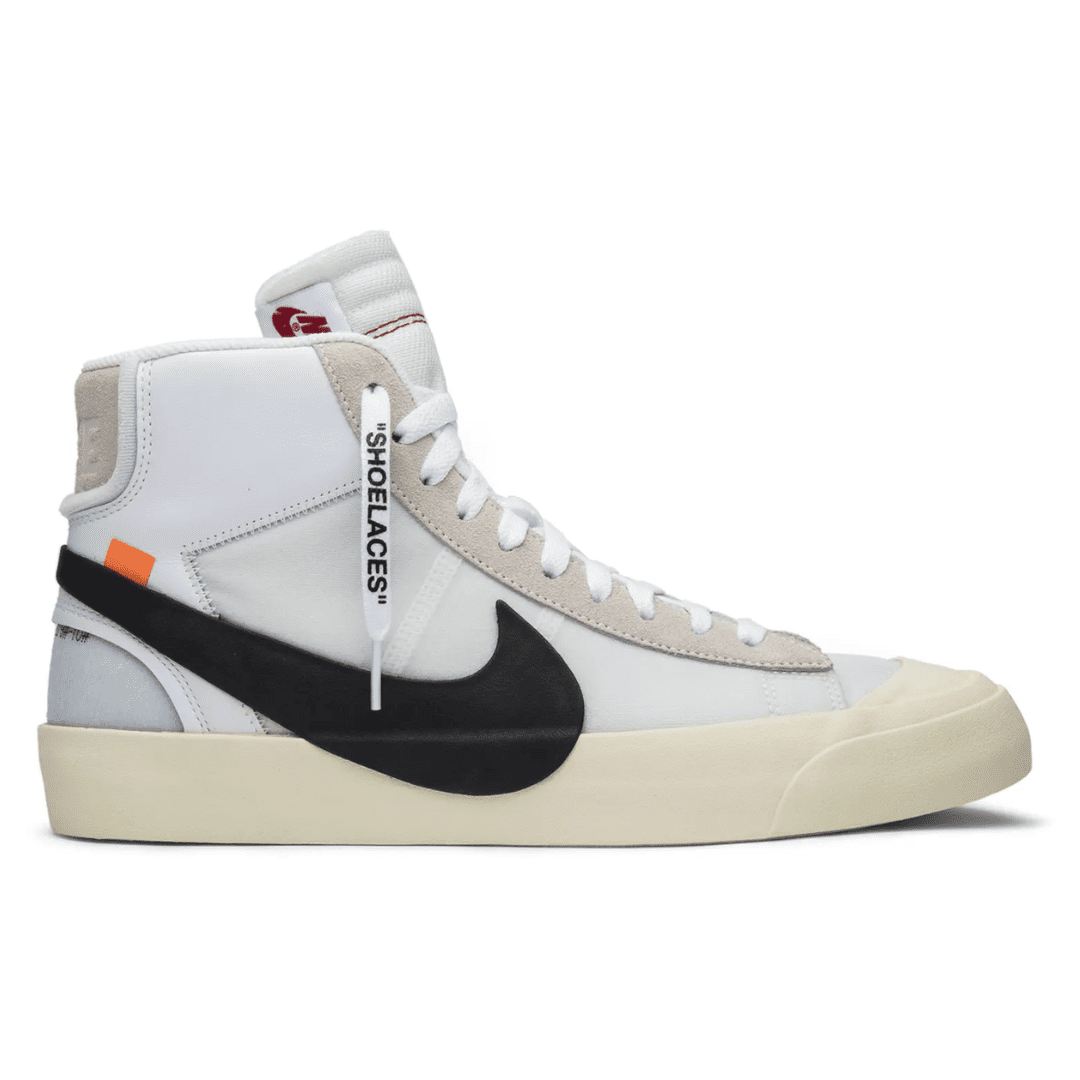 Virgil Abloh’s Nike Off-White Blazer Mid features a white leather upper with an oversized black Nike Swoosh that descends into the midsole. The four lace options – white, black, neon orange, and neon green – come with Abloh’s signature self-referential “SHOELACES” branding. Released in September 2017, this sneaker is a member of the initial five-pair REVEALING group of the Off-White x Nike ‘The Ten’ Collection that included reconstructed designs for the Air Jordan 1, Air Max 90, Nike Air Presto, and Nike Air VaporMax.