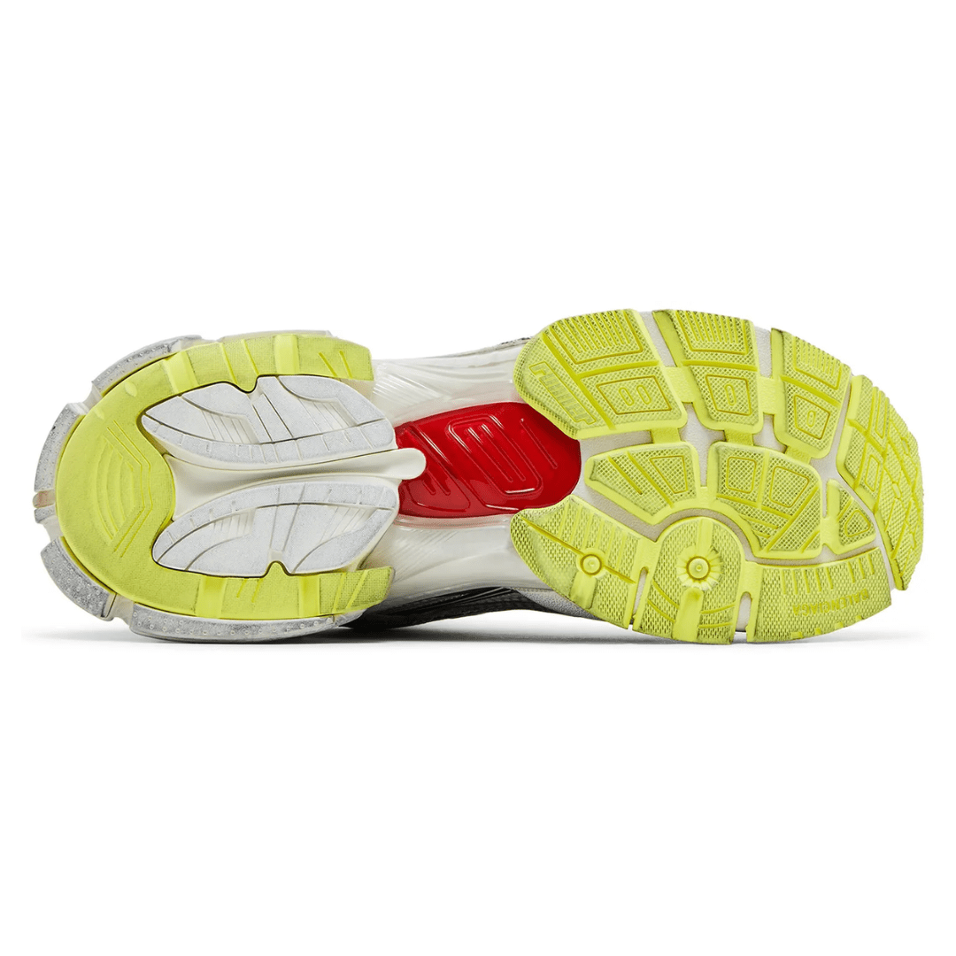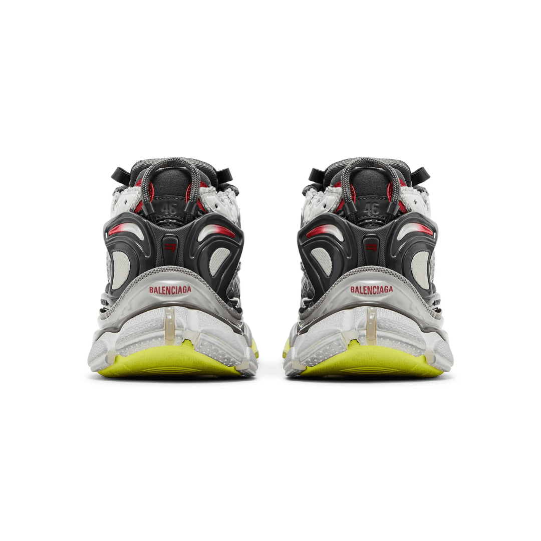 The Balenciaga Runner blends performance heritage with avant-garde design. Featuring layered mesh and synthetic panels in black, white, red, and fluorescent yellow, the sneaker showcases a distressed, hand-finished look with a sculpted sole and exaggerated proportions — a bold reinterpretation of vintage running silhouettes.