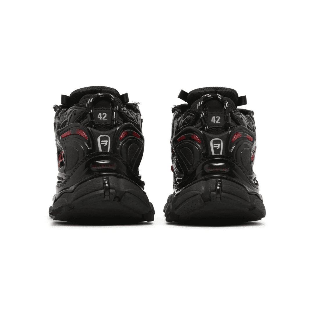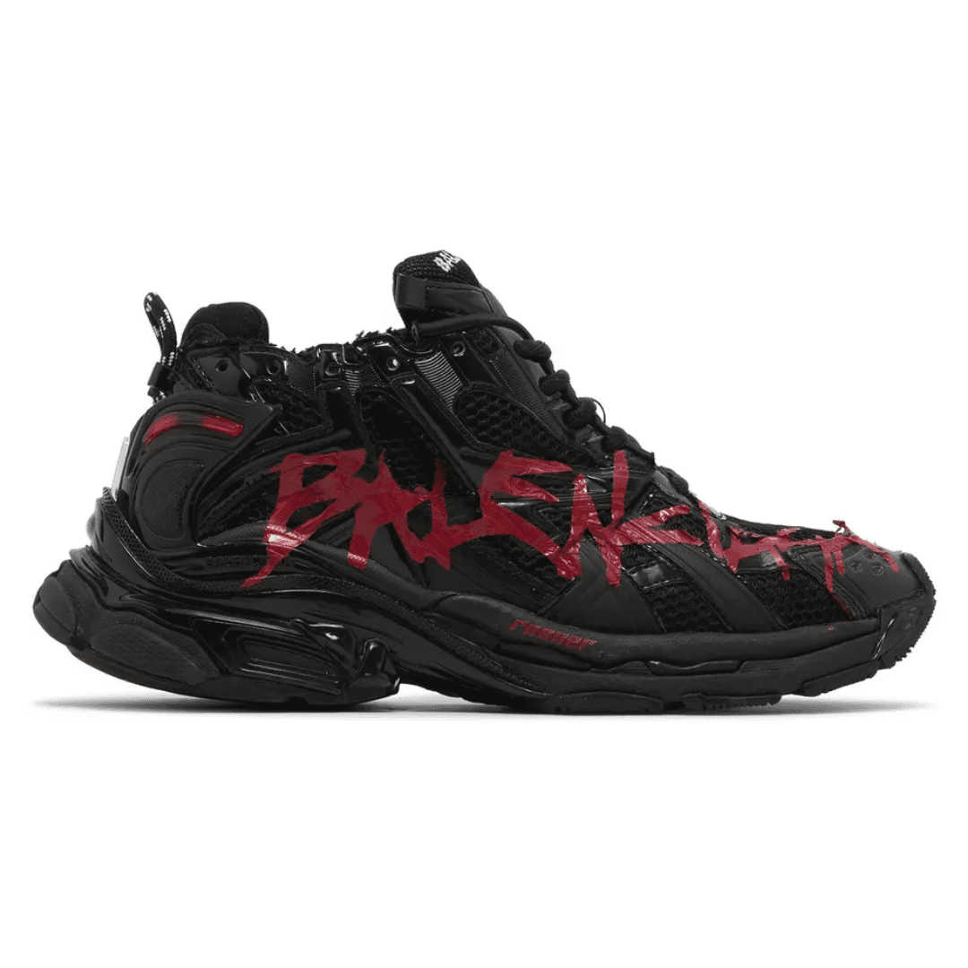 The Runner Sneaker is a deconstructed running shoe concept combining vintage athletic inspiration with Balenciaga’s signature distressed aesthetic. Presented in black and red mesh and nylon, it features hand-finished graffiti detailing for a unique, one-of-a-kind appearance.