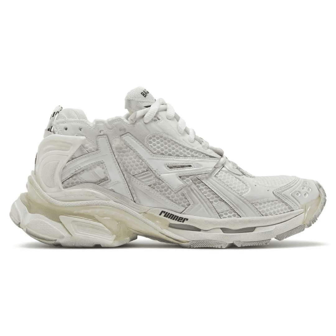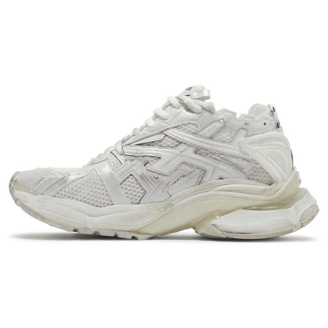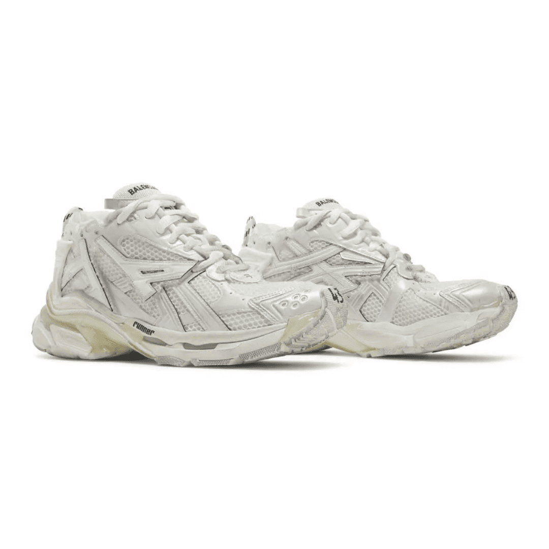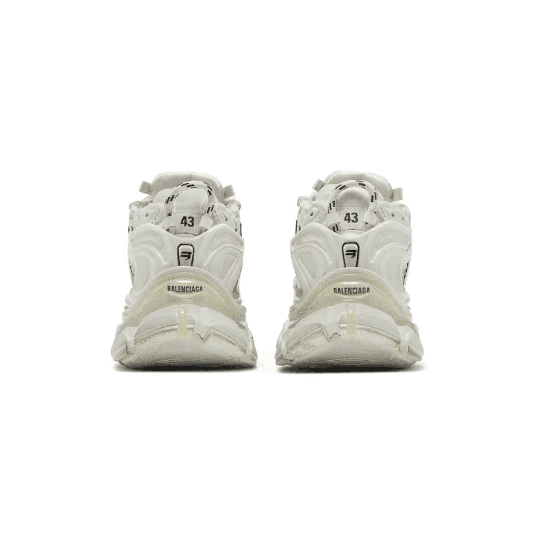 The Runner Sneaker is a concept of deconstructed running footwear, blending retro athletic influences with Balenciaga’s distinctive distressed aesthetic. Crafted in layered white mesh and nylon, each pair is hand-finished to achieve a uniquely worn look that embodies individuality and craftsmanship.