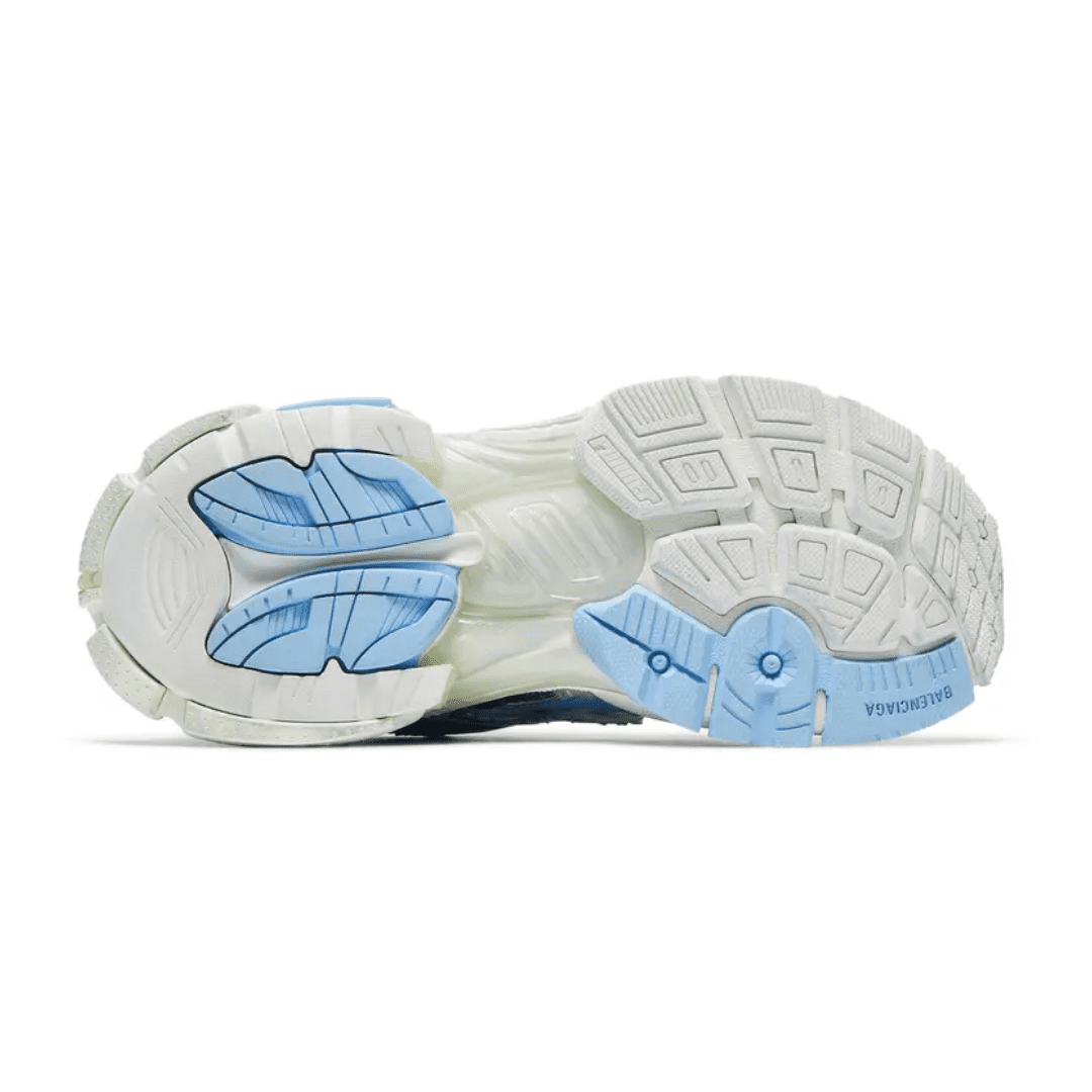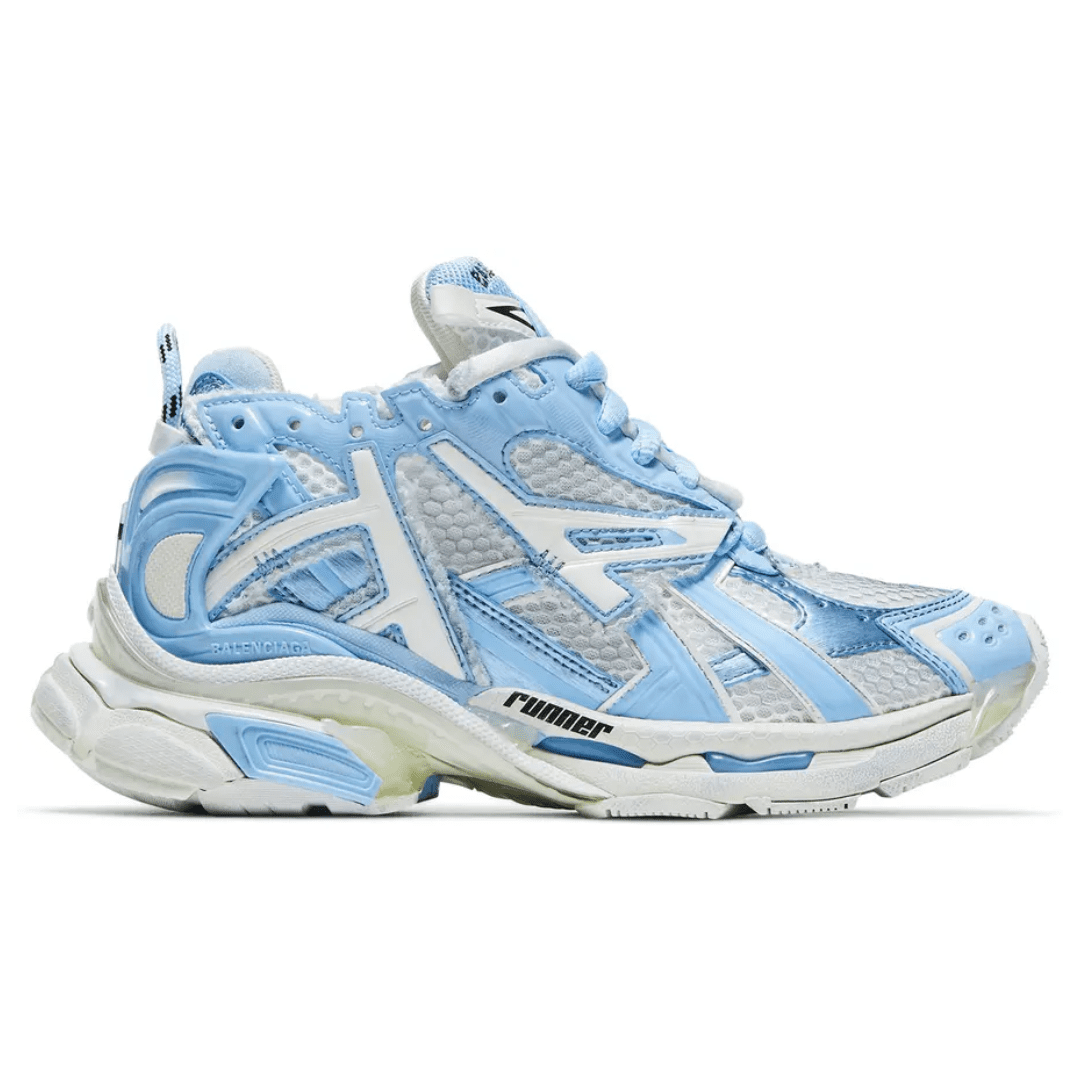 The Runner Sneaker is a deconstructed running-inspired silhouette, blending vintage athletic references with Balenciaga’s signature distressed aesthetic. Crafted in layered light blue mesh and nylon, it highlights texture, dimensionality, and a contemporary streetwear edge.