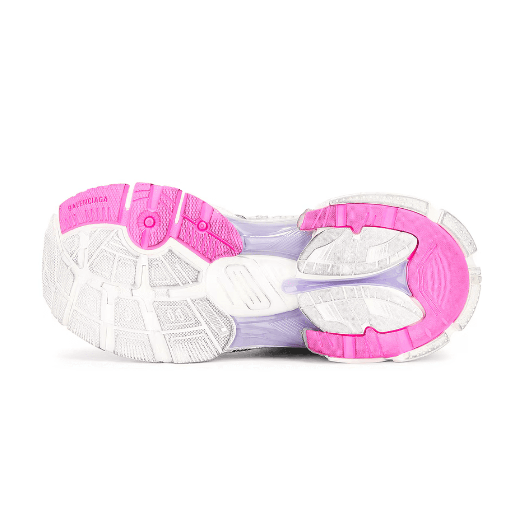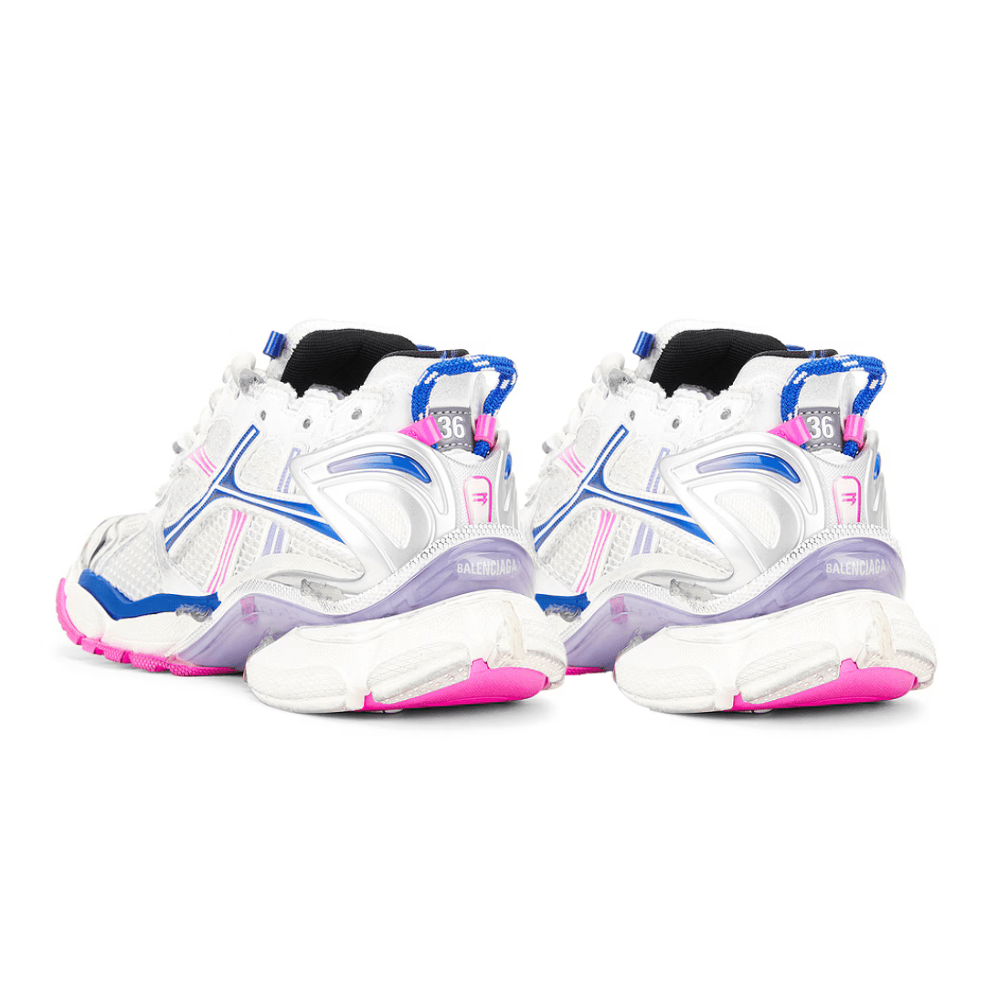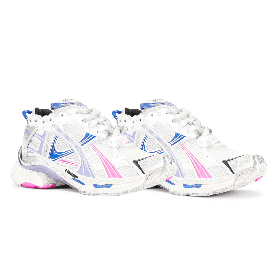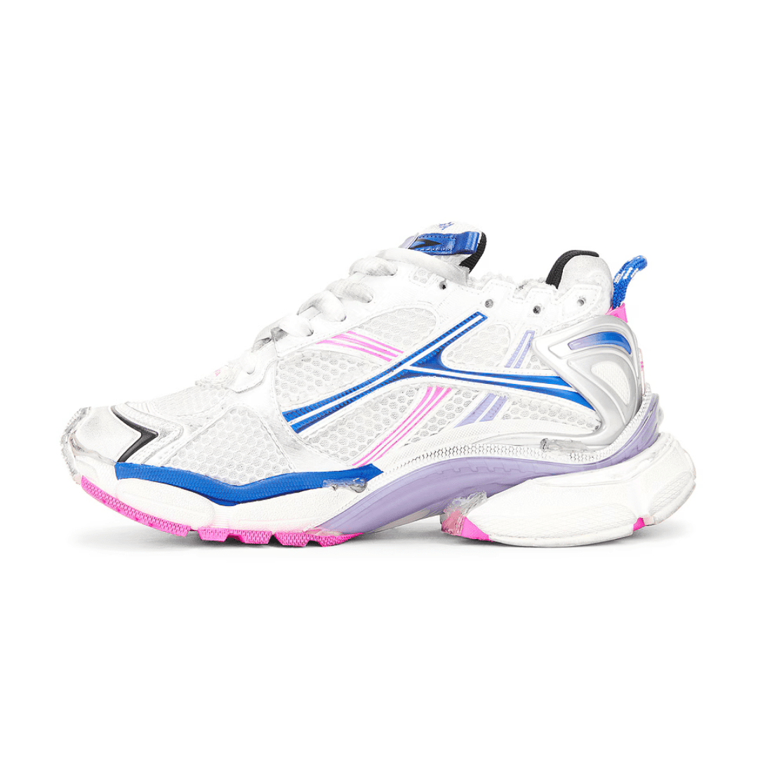 The Balenciaga Runner fuses vintage running aesthetics with a modern, deconstructed design. Crafted from layered mesh and synthetic panels in white, blue, and pink, it features a sculpted sole, hand-finished detailing, and Balenciaga’s signature worn effect for a bold, athletic silhouette.
