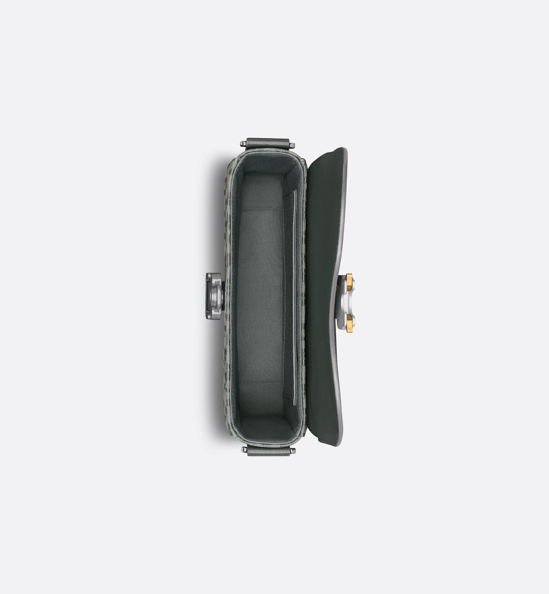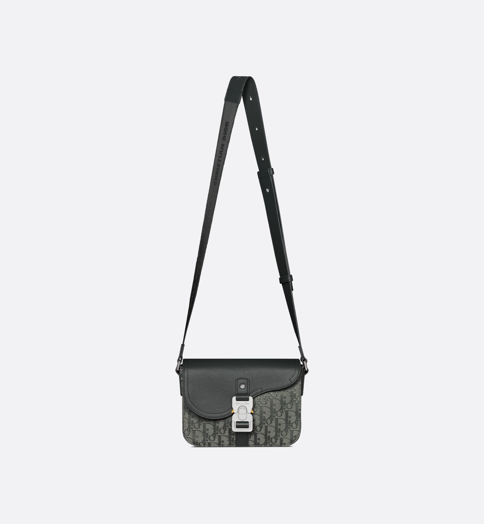 The Saddle messenger bag is a compact and modern creation. Crafted in anthracite gray Dior Oblique canvas with a subtle satin effect, it features an anthracite gray grained calfskin Saddle flap that closes with a contrasting aluminum buckle. Its spacious interior is completed by a rear slip pocket to house all the essentials. The adjustable leather and Christian Dior jacquard strap allows the small style to be worn over the shoulder or crossbody.