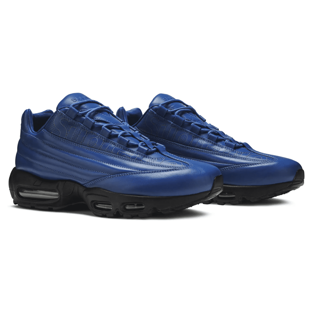 The Sergio Lozano-designed Nike Air Max 95 is given a premium makeup in the Supreme x Air Max 95 Lux ‘Hyper Cobalt’ sneaker. Designed in collaboration with cult skate brand, Supreme, this limited-edition lifestyle runner is part of a trio of colorways released for November 2019. From heel to toe, it sports a blazing blue hue with an upper constructed from premium Italian leather. The signature Supreme logo is laser perforated into the sides, while a debossed logo can be found on the tongue tag and heel.