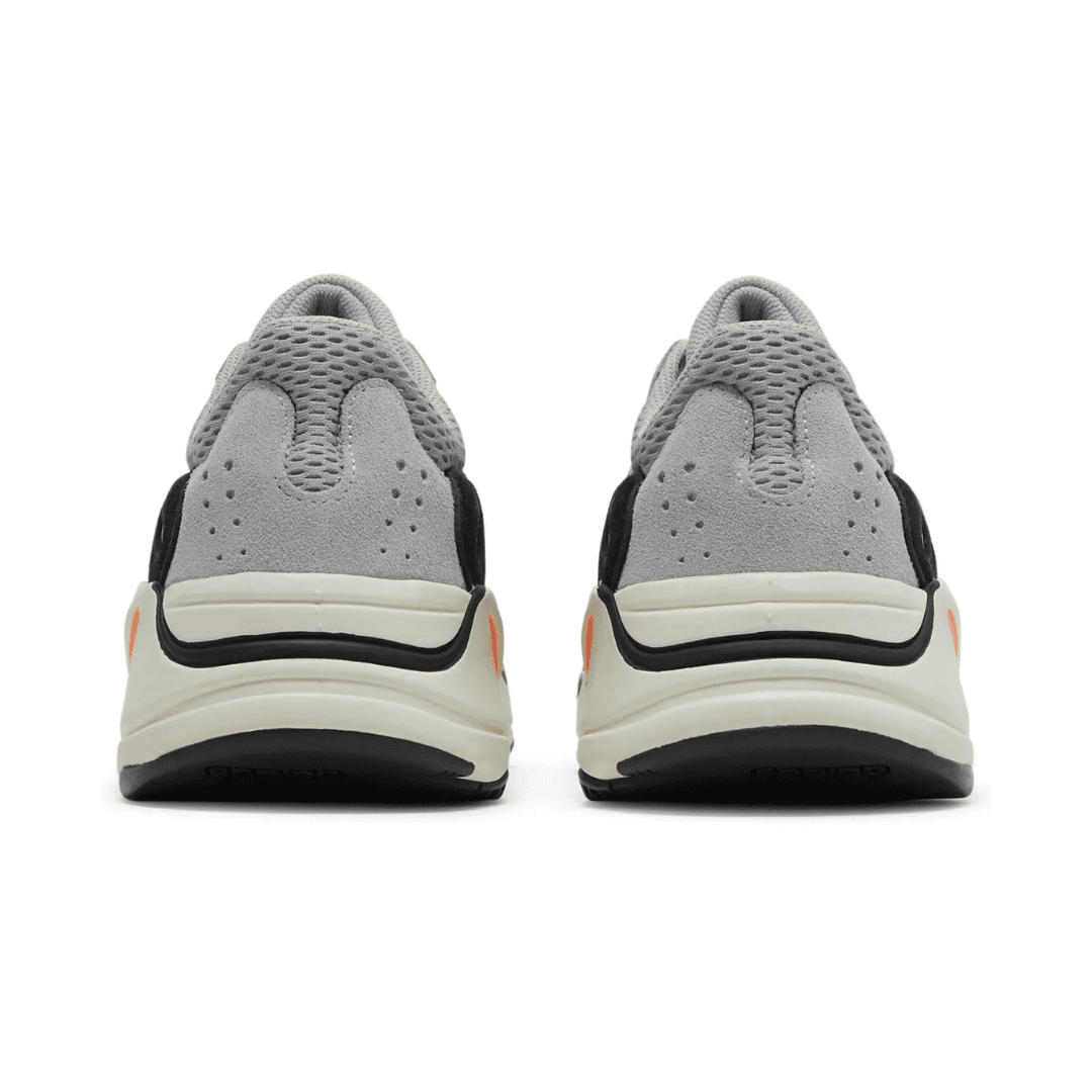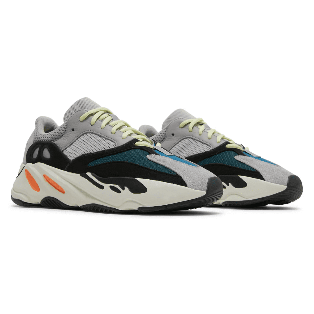 This inaugural colorway of Kanye West’s Yeezy Wave Runner 700 launched in November 2017, following a public debut earlier in the year as part of the Yeezy Season 5 runway show. The sneaker’s retro-inspired lines worked in tandem with a chunky silhouette reminiscent of an earlier era. A mesh base is finished in grey on the quarter panels and bright blue and teal on the forefoot. Suede overlays arrive on the toe and heel accented grey leather eyestays. Other details include neon green laces, a bulky white midsole, and pops of black and bright orange.