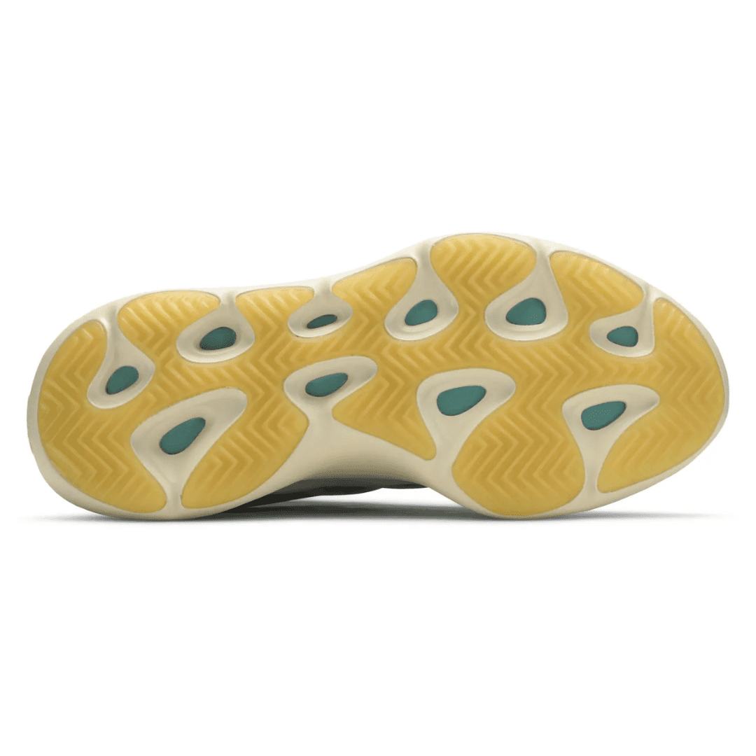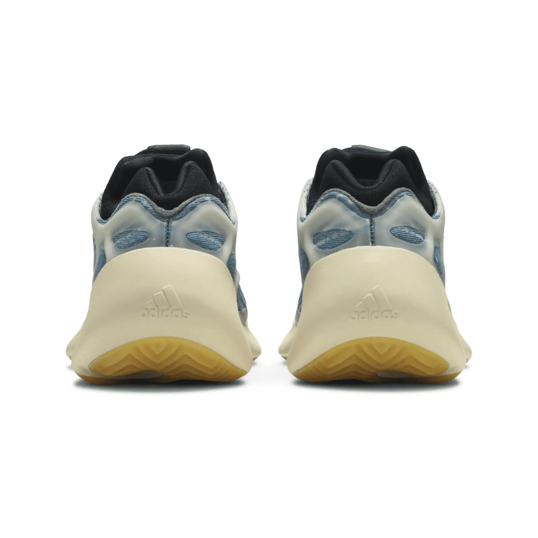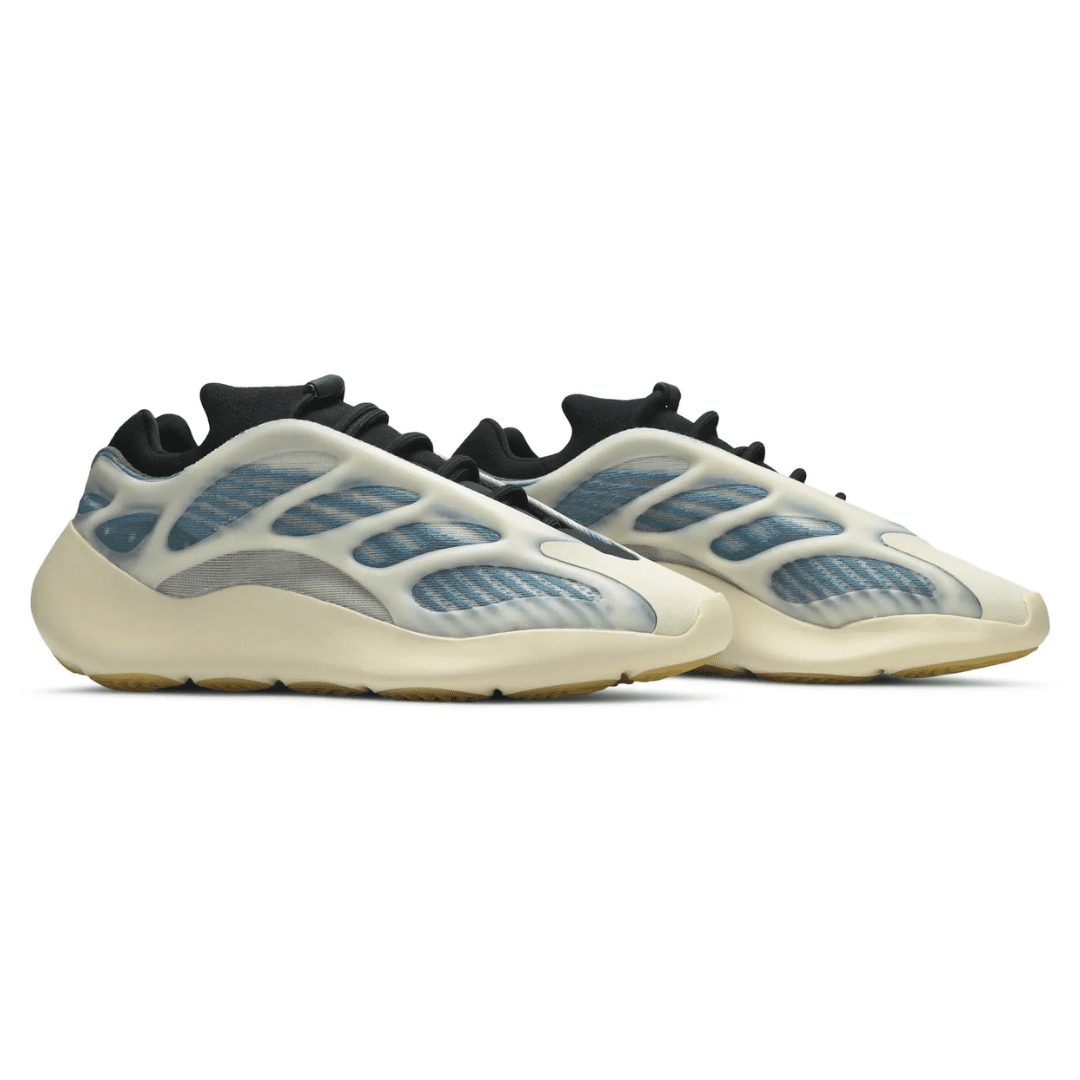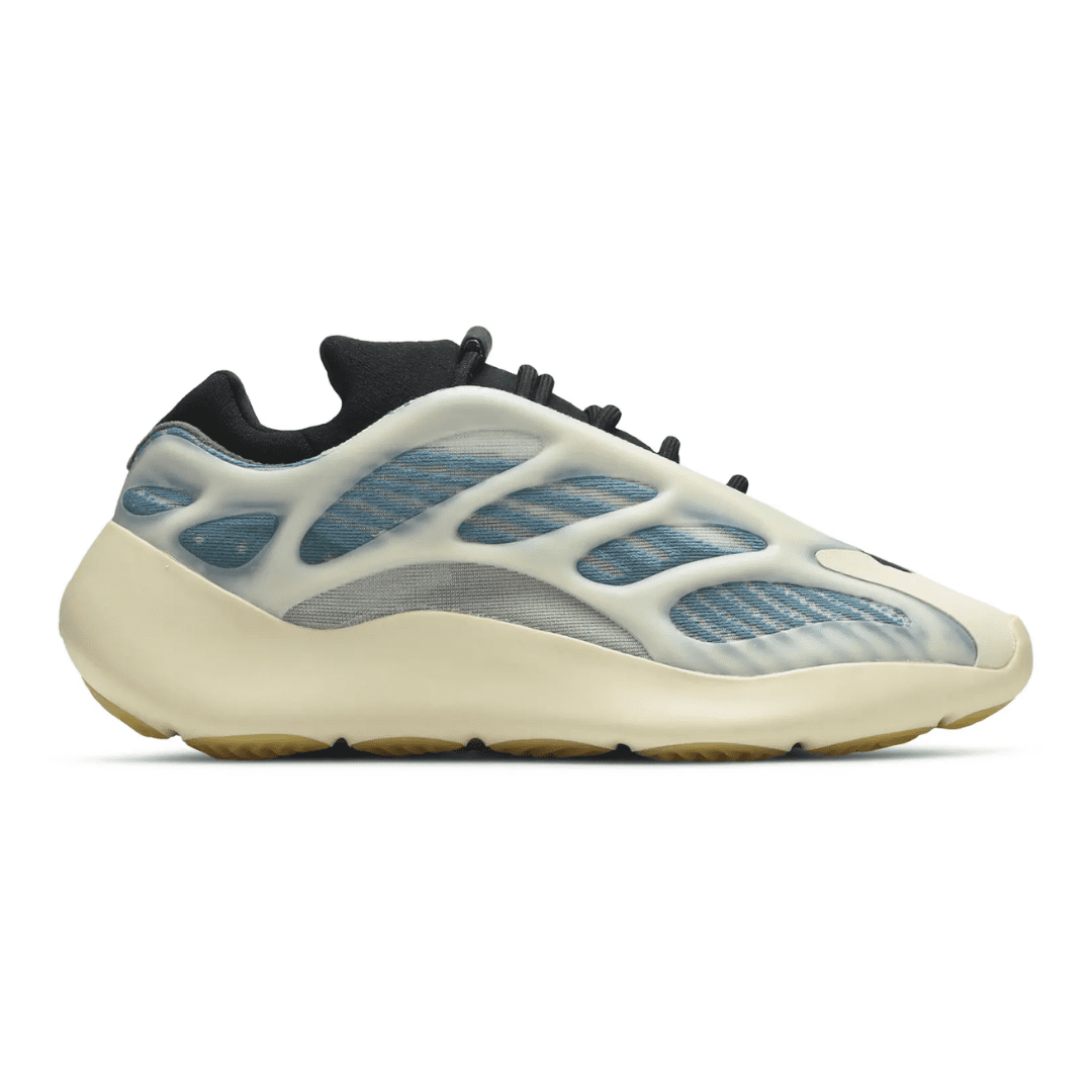 The adidas Yeezy 700 V3 ‘Kyanite’ showcases flowing stripes of blue coloring throughout the breathable upper, constructed from monofilament engineered mesh with exoskeletal RPU overlays coated in a glow-in-the-dark finish. Interior bootie construction delivers a snug fit, while a reinforced rubber toe cap provides added durability. The sneaker rides on a lightweight EVA midsole encapsulated in an off-white PU cage, supported by a herringbone rubber outsole.
